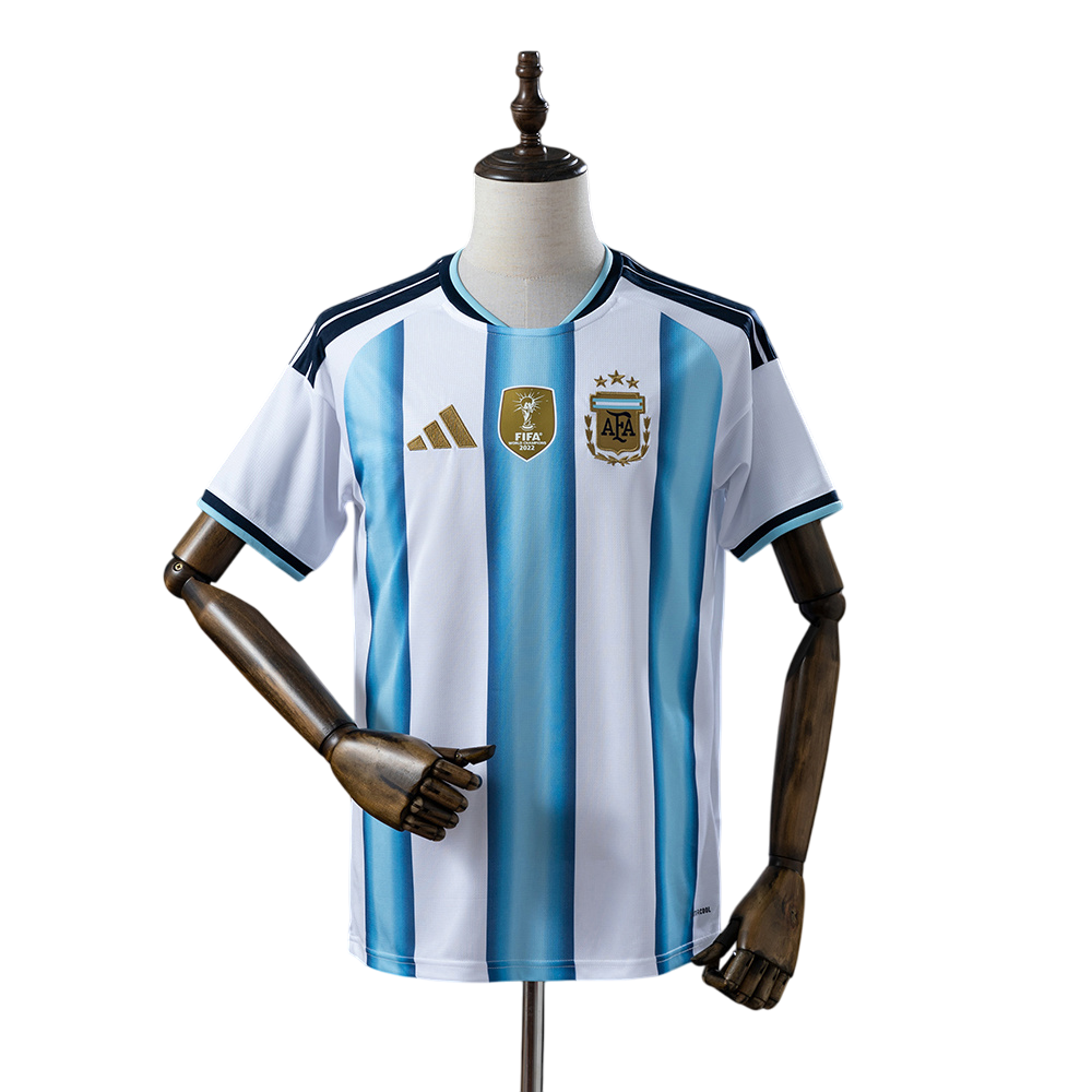 Camiseta local de la selección argentina, con los clásicos bastones verticales en celeste y blanco reinterpretados con un degradado moderno. Presenta detalles en azul oscuro en hombros y mangas, escudo de la AFA con las tres estrellas y parche dorado de campeón del mundo en el pecho, combinando tradición e identidad moderna de la Albiceleste.