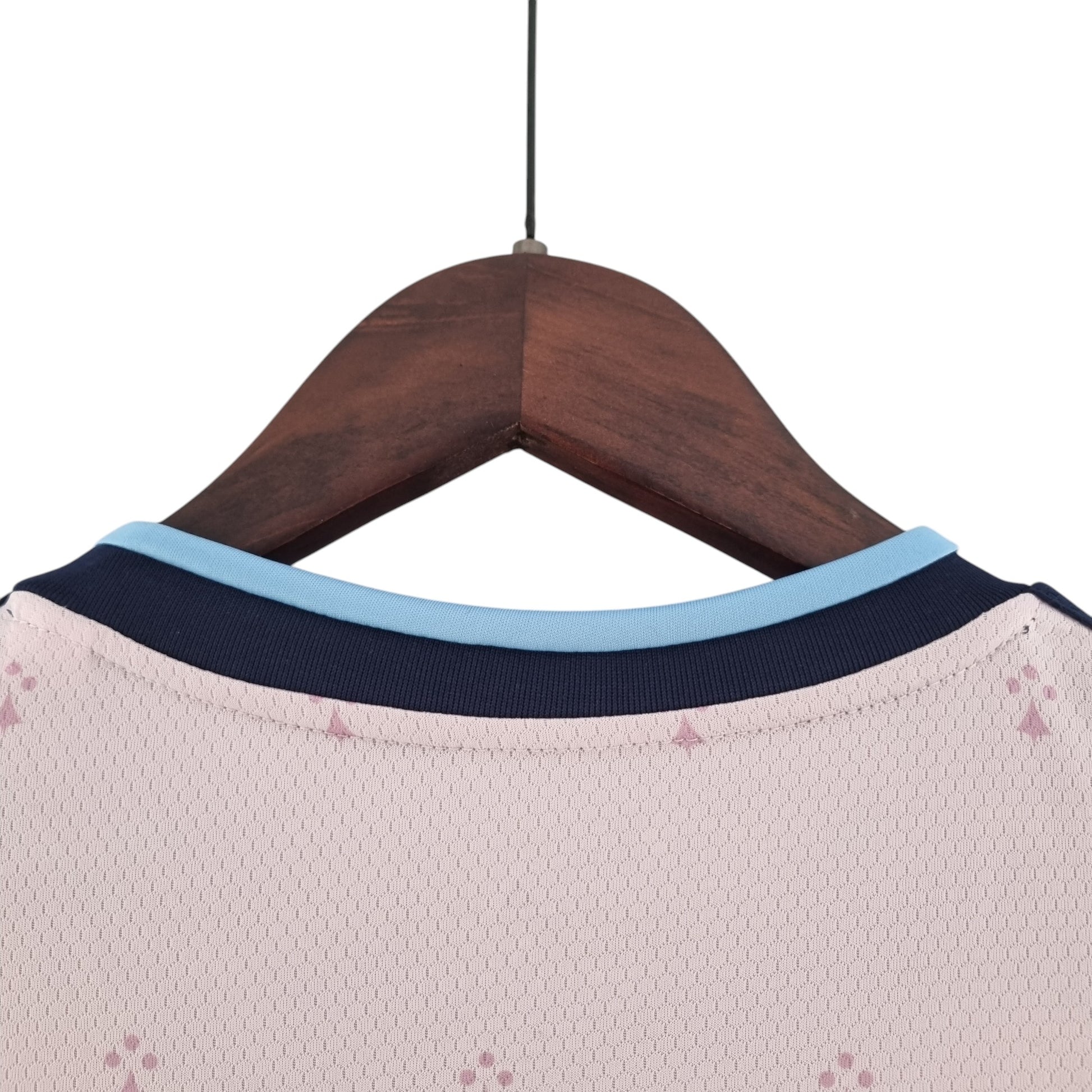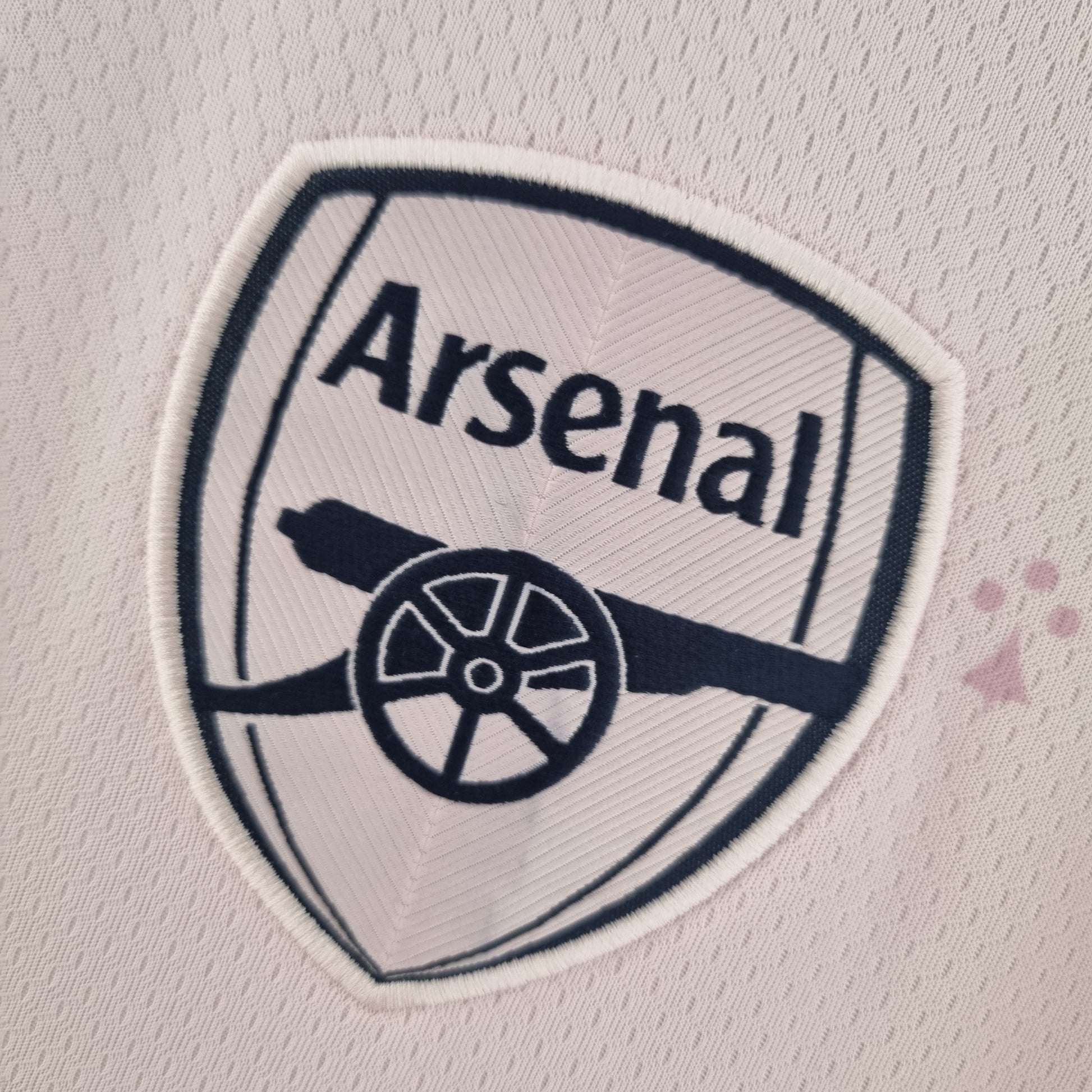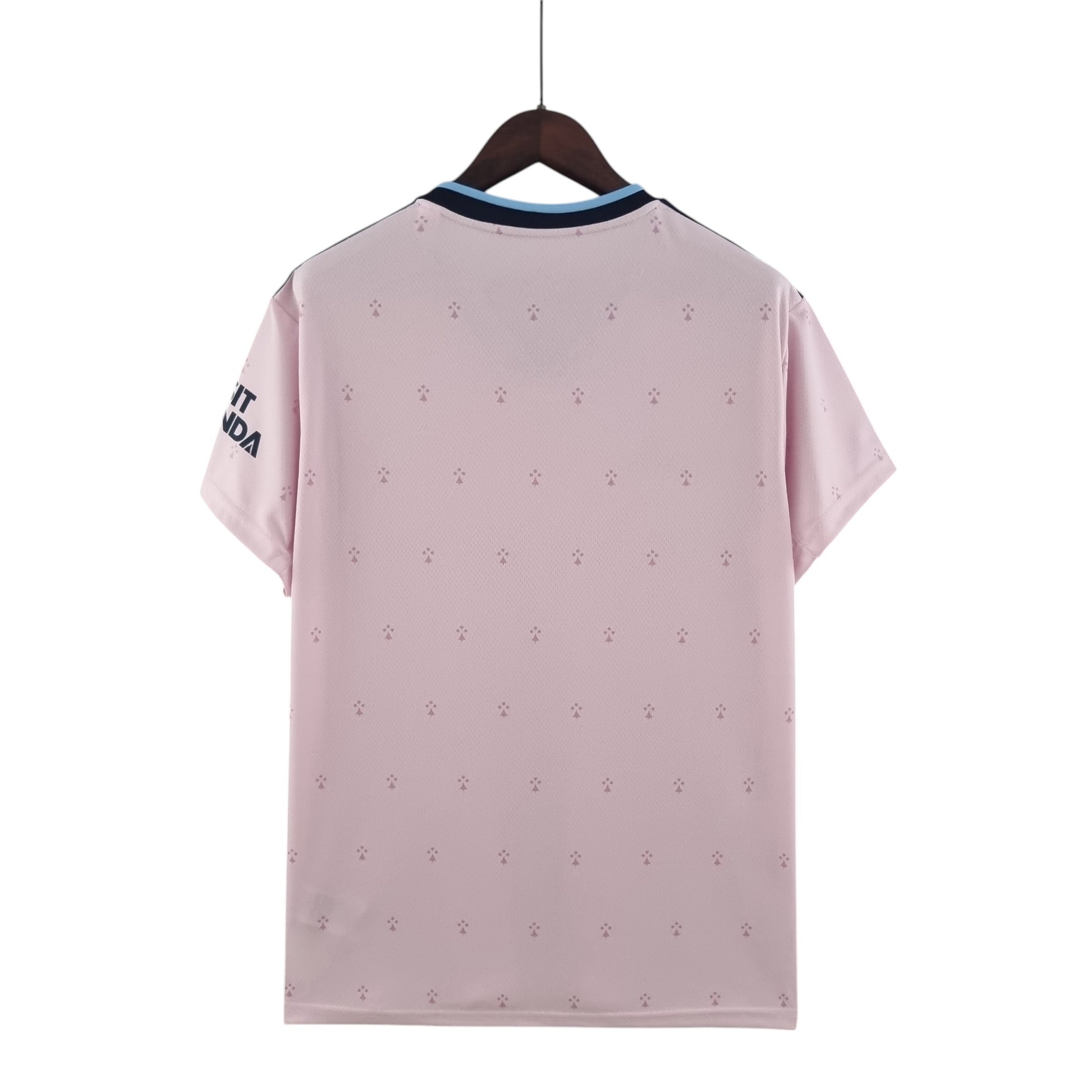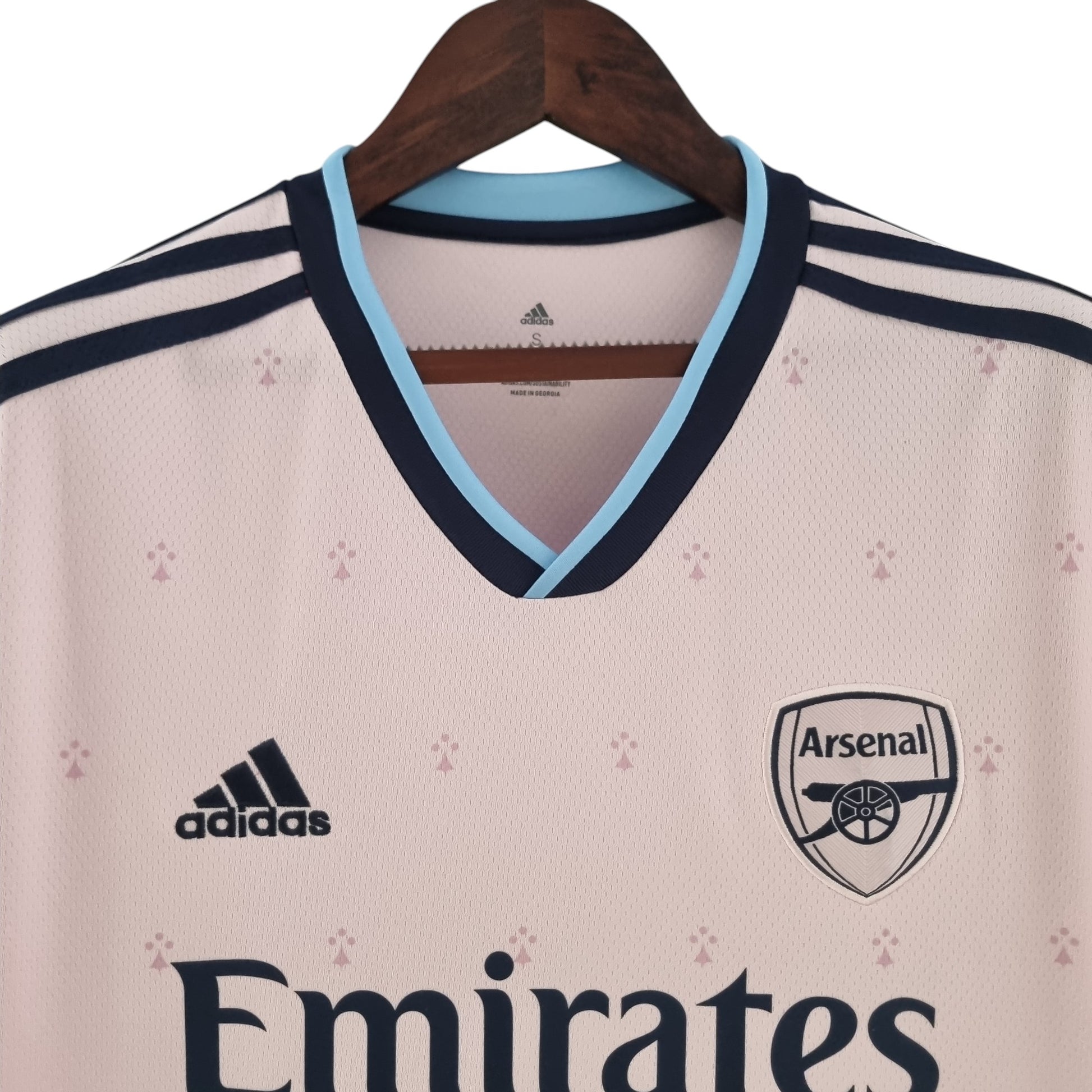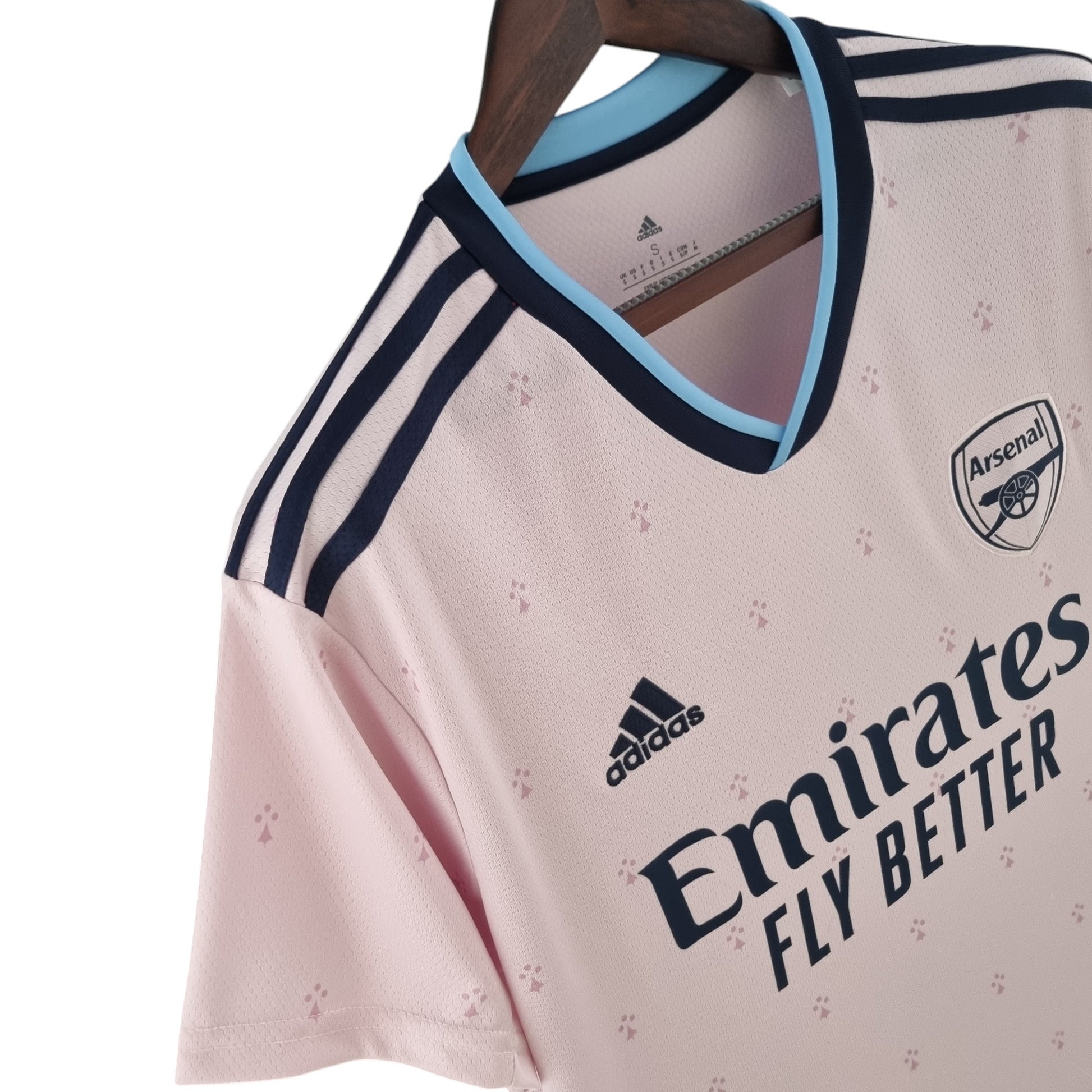 La tercera equipación de la temporada 2022/2023 te transportará a una era de fútbol inolvidable. El diseño de Adidas, con su llamativo color rosa y detalles en azul marino, combinado con el logo de Fly Emirates.