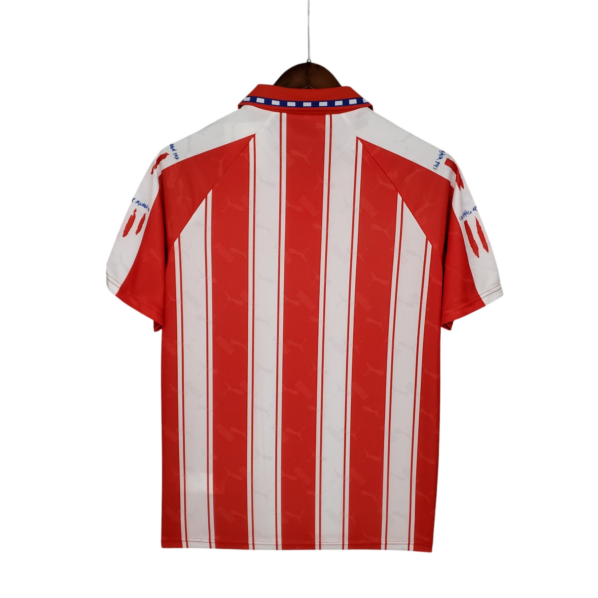 Una camiseta icónica que marcó una era, la primera equipación del Atlético de Madrid 1994/95, diseñada por Puma y patrocinada por Marbella, destaca por su diseño clásico con franjas rojiblancas y detalles en azul. Esta temporada fue clave en la reconstrucción del equipo que, con jugadores como Kiko, Caminero y Simeone, sentó las bases del histórico doblete que llegaría poco después. Con su elegante cuello con botones y las icónicas garras en las mangas, esta camiseta es una pieza imprescindible para los colchoneros que quieren revivir la pasión del Atleti en los años 90