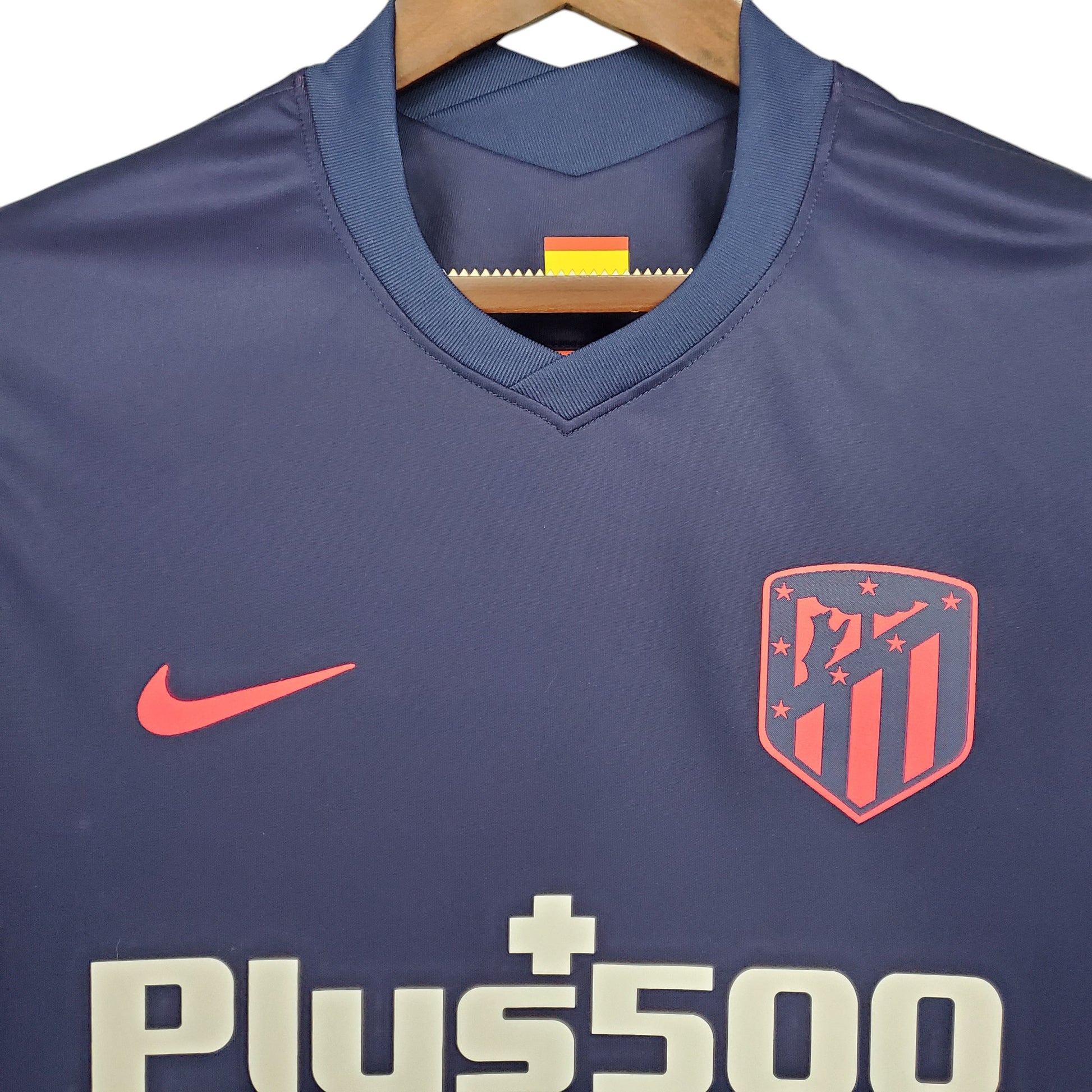 Una equipación con carácter, esta segunda camiseta del Atlético de Madrid 2021/22, diseñada por Nike y patrocinada por Plus500, presenta un llamativo diseño en azul marino con un efecto de pinceladas rojizas en la parte inferior, simbolizando la pasión y entrega del equipo colchonero. En esta temporada, el Atleti defendía su título de campeón de LaLiga, con figuras clave como Luis Suárez, Griezmann, Koke y João Félix. Con el escudo y el logo en tonos rojizos y un ajuste moderno con tecnología Dri-FIT