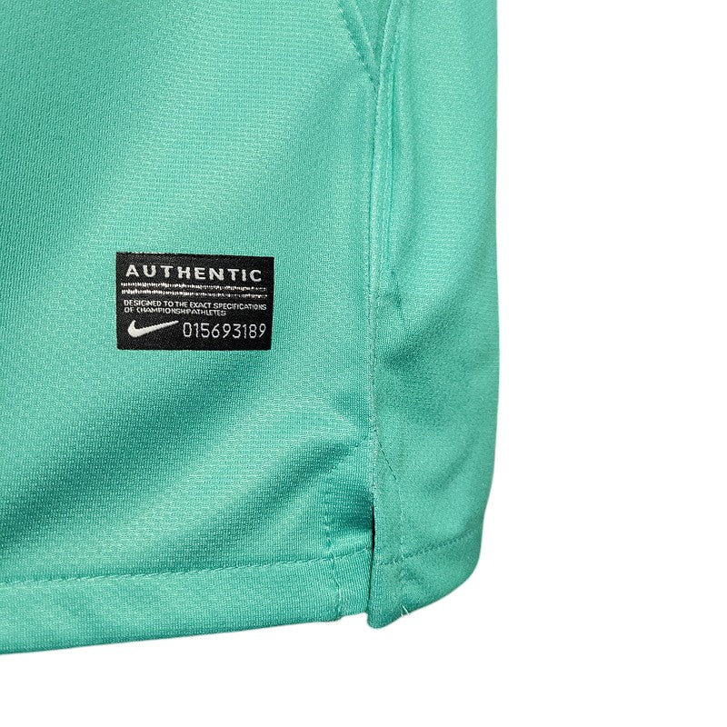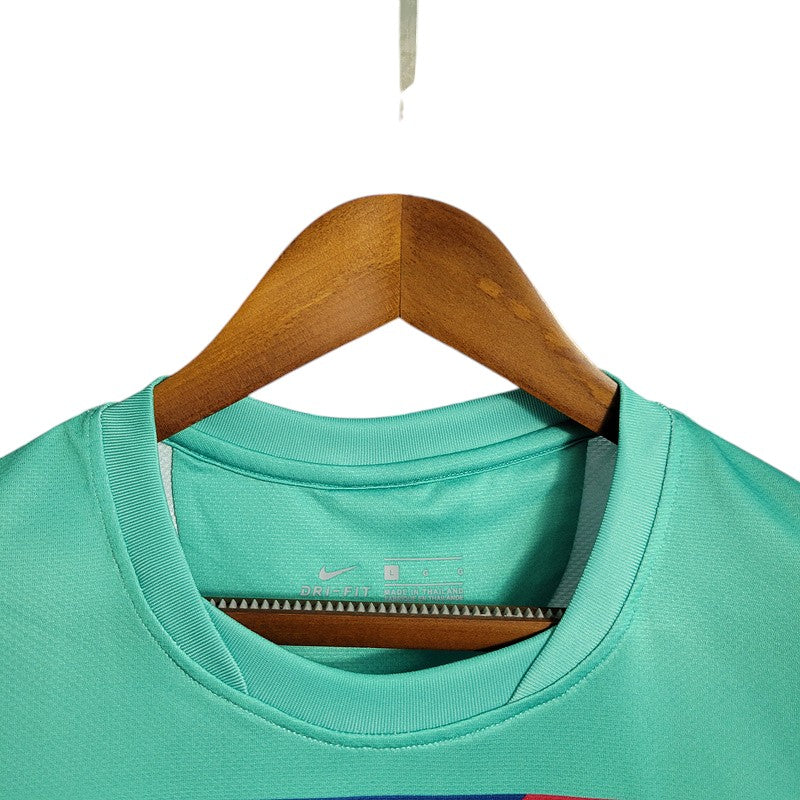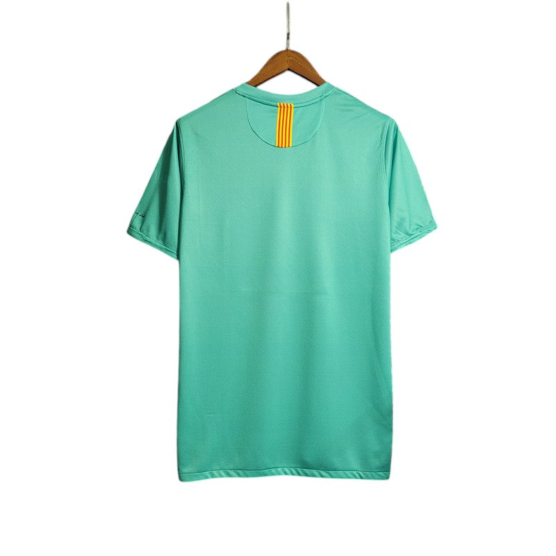 La temporada 2010/11 fue una de las más memorables en la historia del FC Barcelona, con el equipo de Pep Guardiola logrando la gloria en la Champions League y consolidando su estilo de juego único. Esta espectacular segunda equipación en verde menta con la emblemática franja azulgrana simboliza el dominio y la elegancia del equipo en aquella era dorada.
