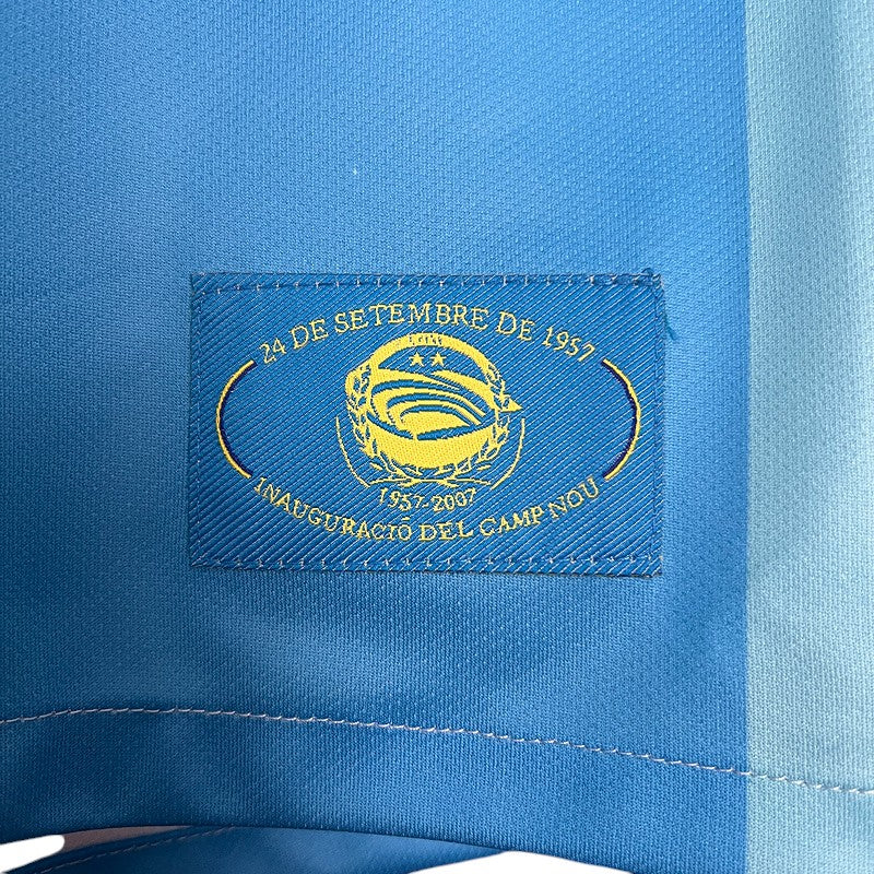 Revive la histórica temporada 2007/08 con esta icónica segunda equipación del FC Barcelona. Este diseño en tonos celestes rinde homenaje a los colores alternativos del club y conmemora el 50 aniversario del Camp Nou, con un escudo especial bordado.
