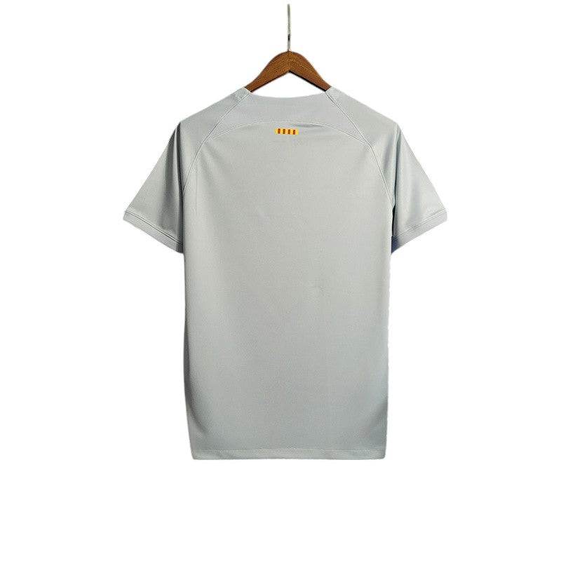 La temporada 2022/23 trajo consigo un diseño innovador para el FC Barcelona, con esta tercera equipación en tono blanco con una cruz azulgrana, inspirada en la bandera de Sant Jordi, símbolo de la ciudad de Barcelona. Una camiseta única que refleja la tradición y la identidad del club.