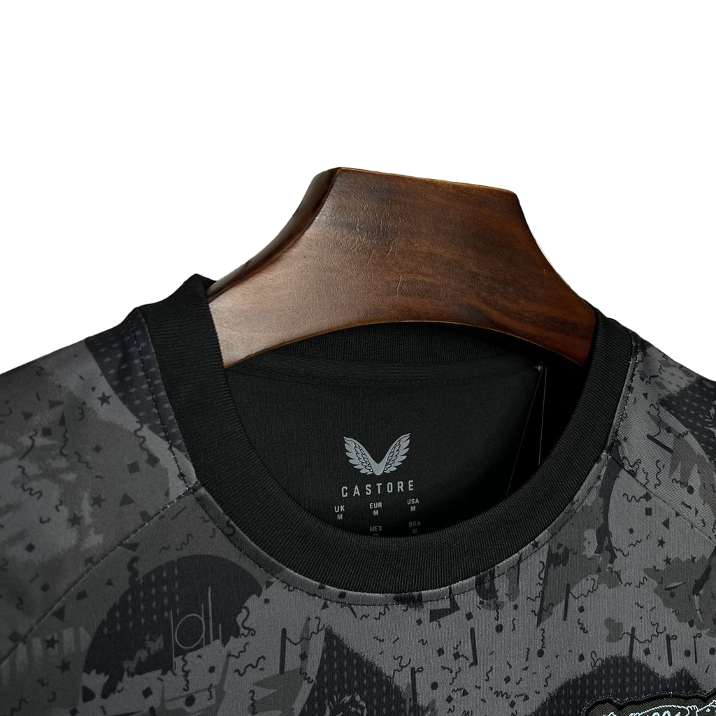 Camiseta tercera equipación del Bayer Leverkusen temporada 2024/2025. Diseño negro con detalles en blanco y un patrón urbano único.