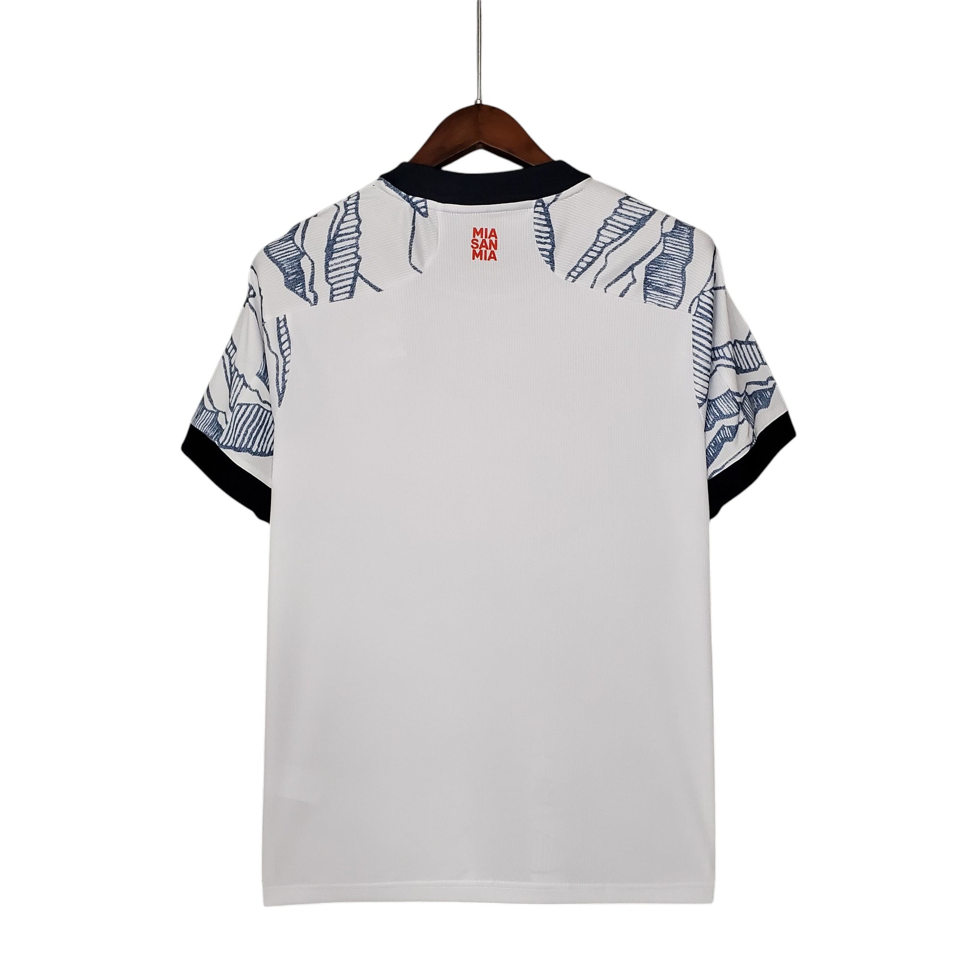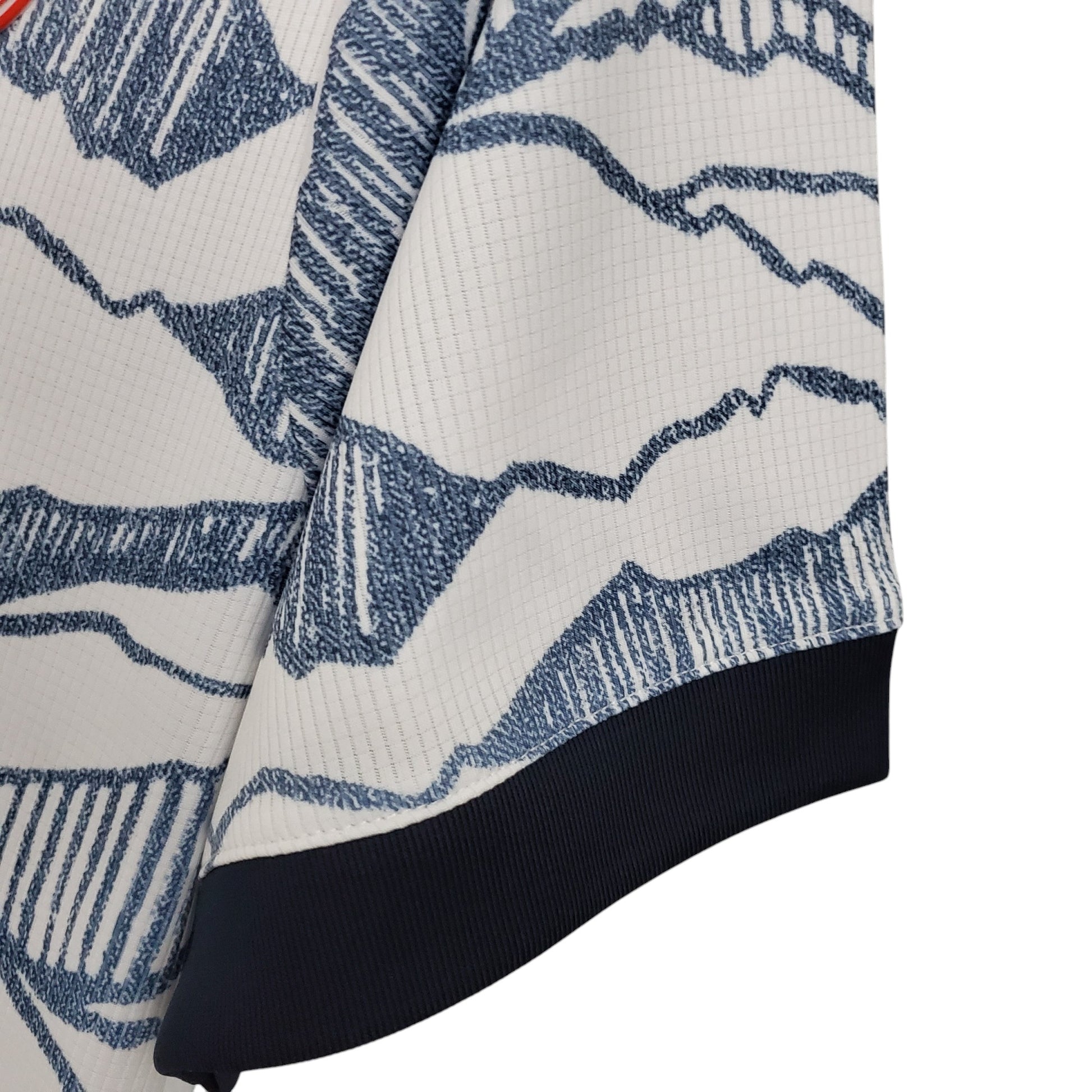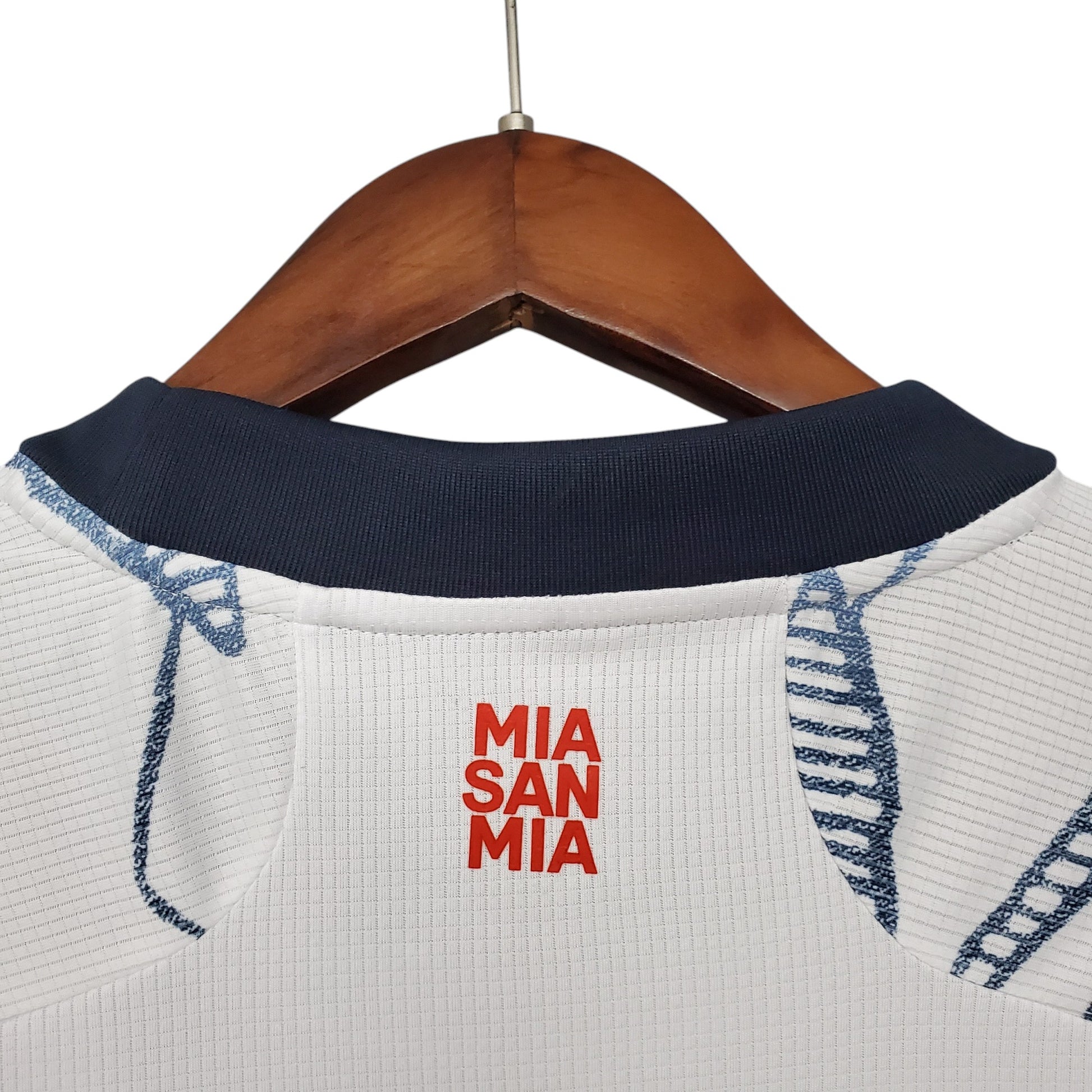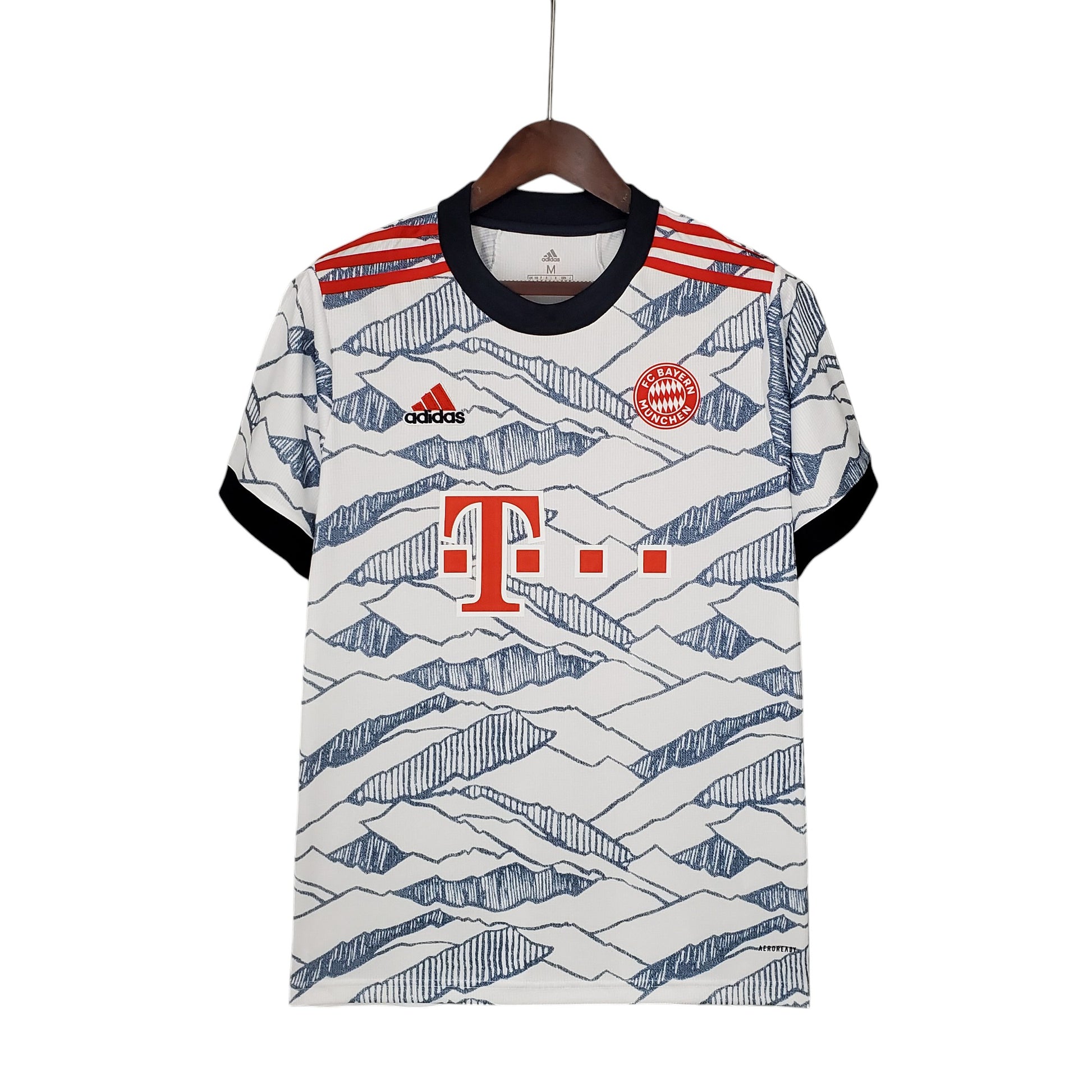 La tercera equipación del Bayern Munich para la temporada 2021/22 está inspirada en los paisajes montañosos de los Alpes bávaros, reflejados en un patrón gráfico en tonos azul y blanco. Diseñada por Adidas, esta camiseta destaca por los detalles en rojo vibrante, incluyendo el logo del patrocinador y el escudo del club. Durante esta temporada, el Bayern Munich continuó su dominio en la Bundesliga, logrando su décimo título consecutivo y consolidándose como el equipo más laureado de Alemania.