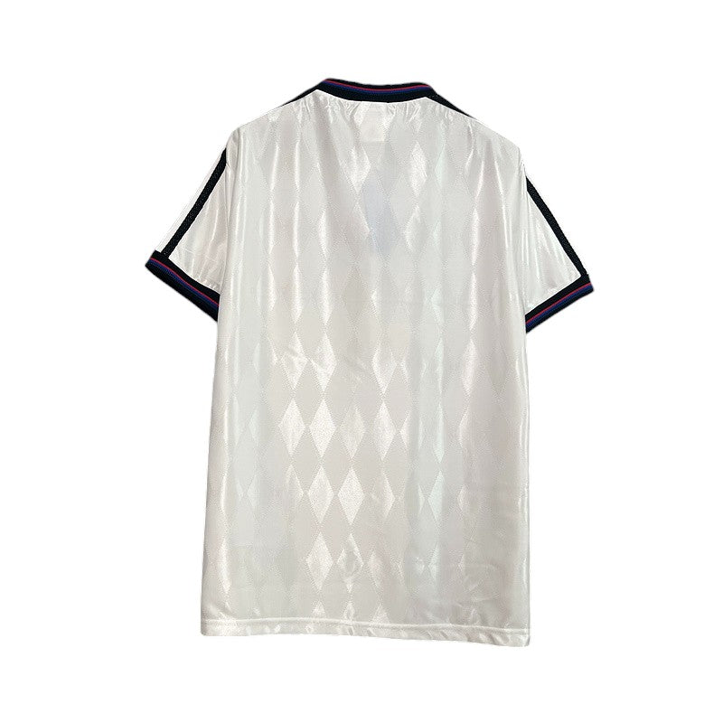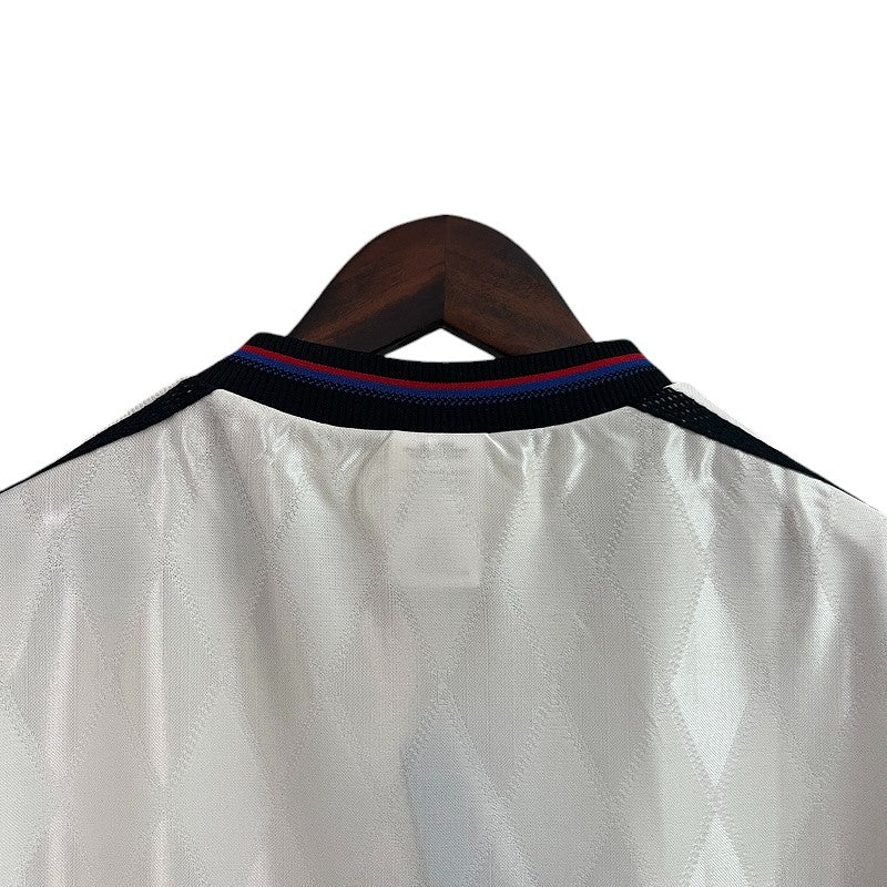 Esta icónica camiseta blanca del Bayern Múnich, con franjas en rojo y azul en un costado, fue utilizada por el equipo bávaro en sus compromisos como visitante entre 1996 y 1998. Diseñada por Adidas y patrocinada por Opel, destaca por su elegancia y simplicidad. Durante este periodo, el Bayern conquistó la Bundesliga 1996/97 y llegó a la final de la Champions League 1998/99, en la que protagonizó un duelo inolvidable contra el Manchester United en el Camp Nou.