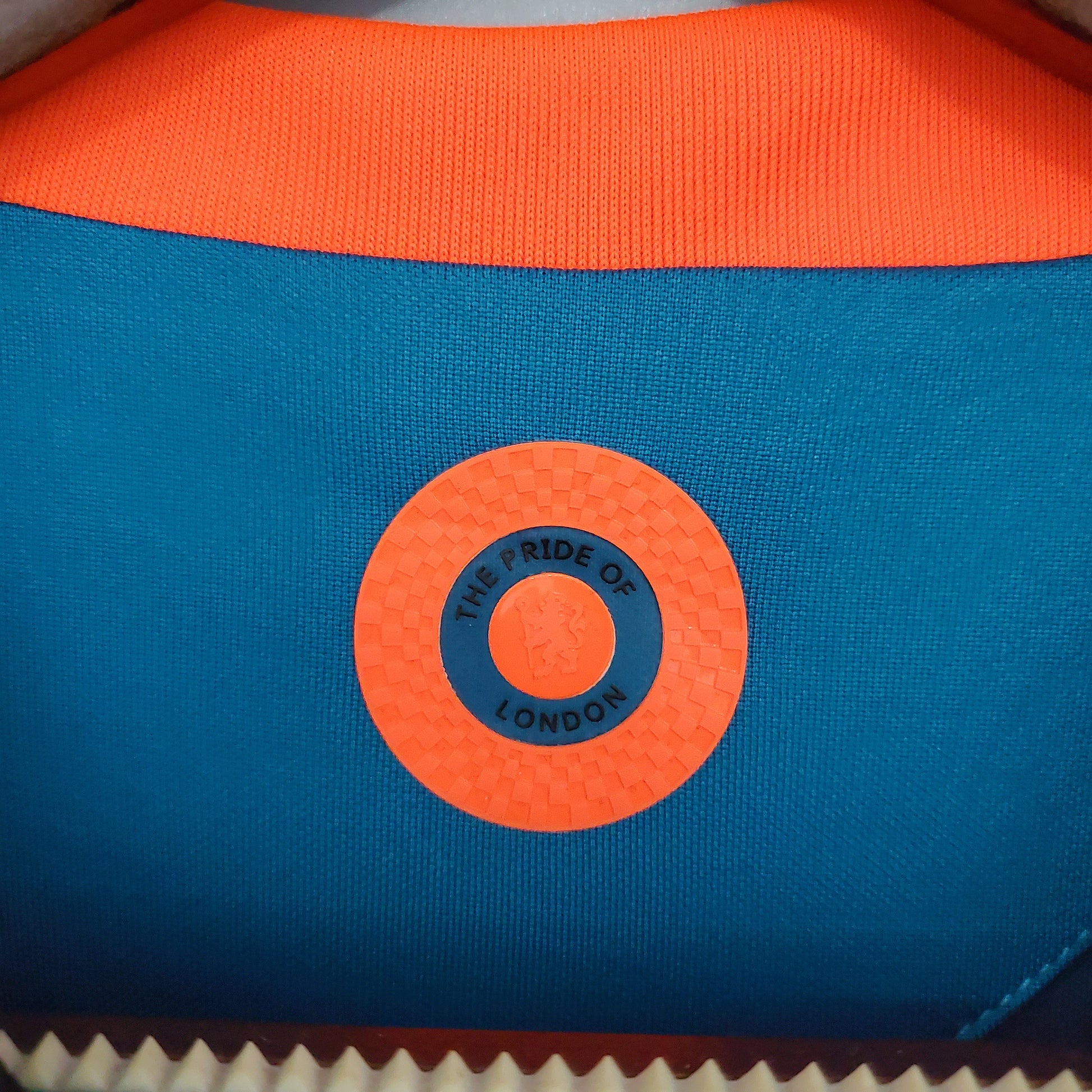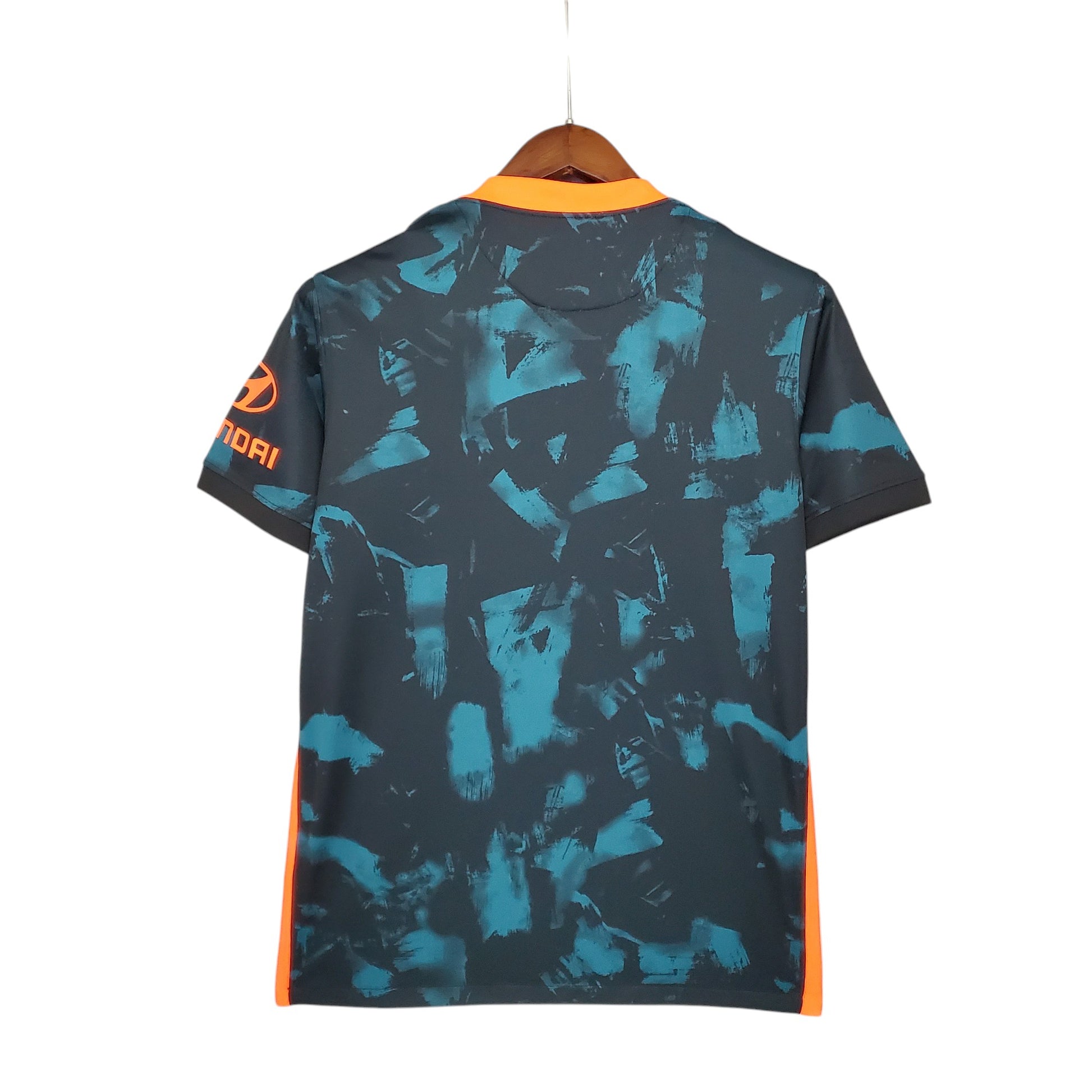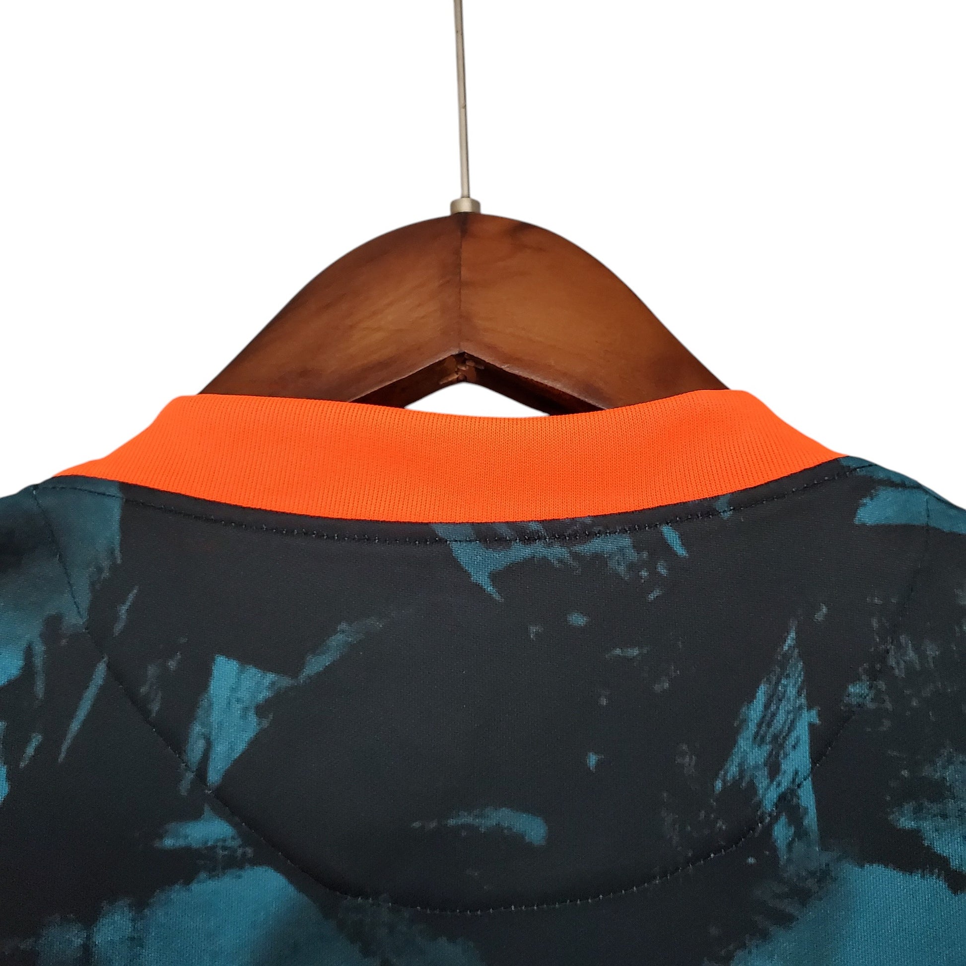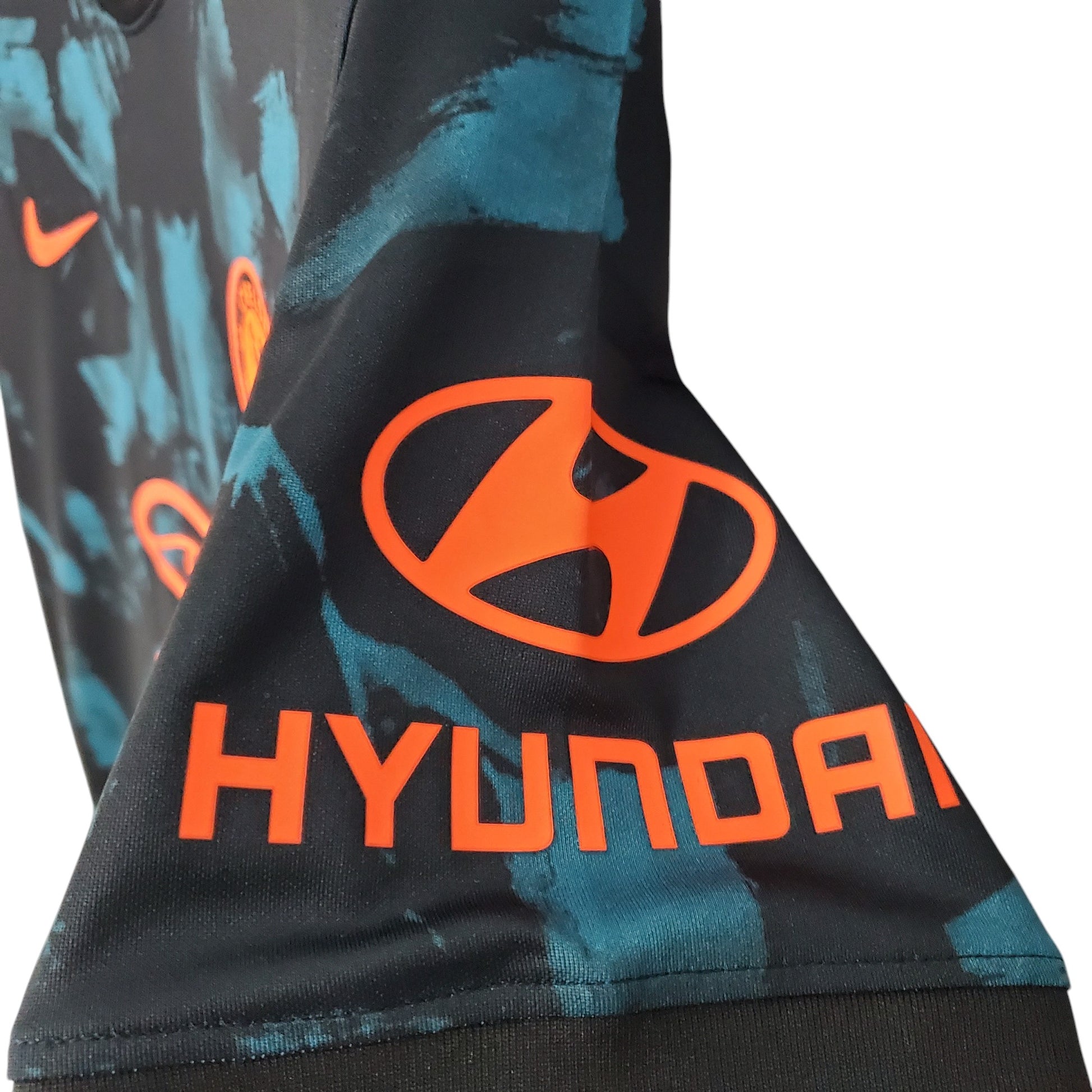 Un diseño atrevido y moderno de Nike, esta tercera equipación del Chelsea presenta un patrón abstracto en negro con detalles en azul petróleo, complementado con acentos en naranja neón. Inspirada en el estilo urbano londinense, esta camiseta fue utilizada en varias competiciones durante la temporada en la que los Blues ganaron el Mundial de Clubes de la FIFA 2021, convirtiéndose en campeones del mundo.