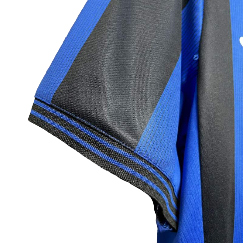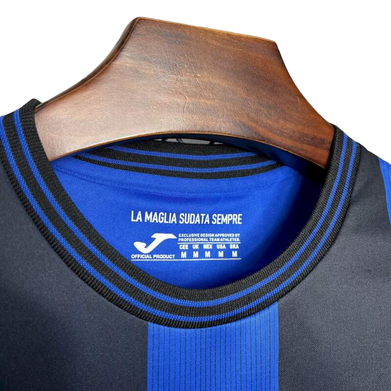 Camiseta Atalanta 2024/25. Primera equipación oficial. Diseño clásico con rayas verticales en azul y negro.