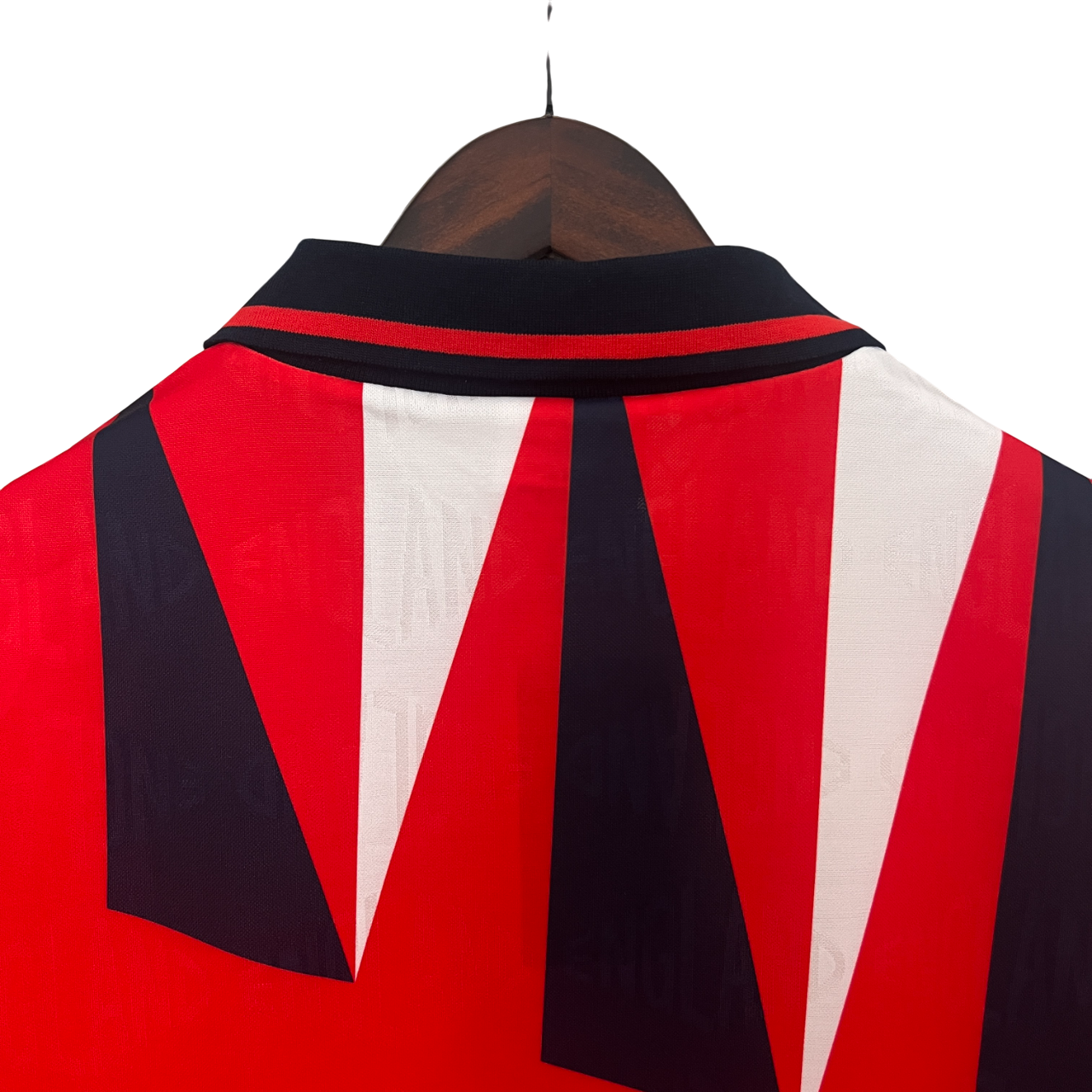 Sumérgete en la nostalgia de una Eurocopa inolvidable con esta réplica de la camiseta que vistieron los "Three Lions". El cuello polo, las llamativas franjas diagonales y el escudo de la FA te transportarán a los años 90.