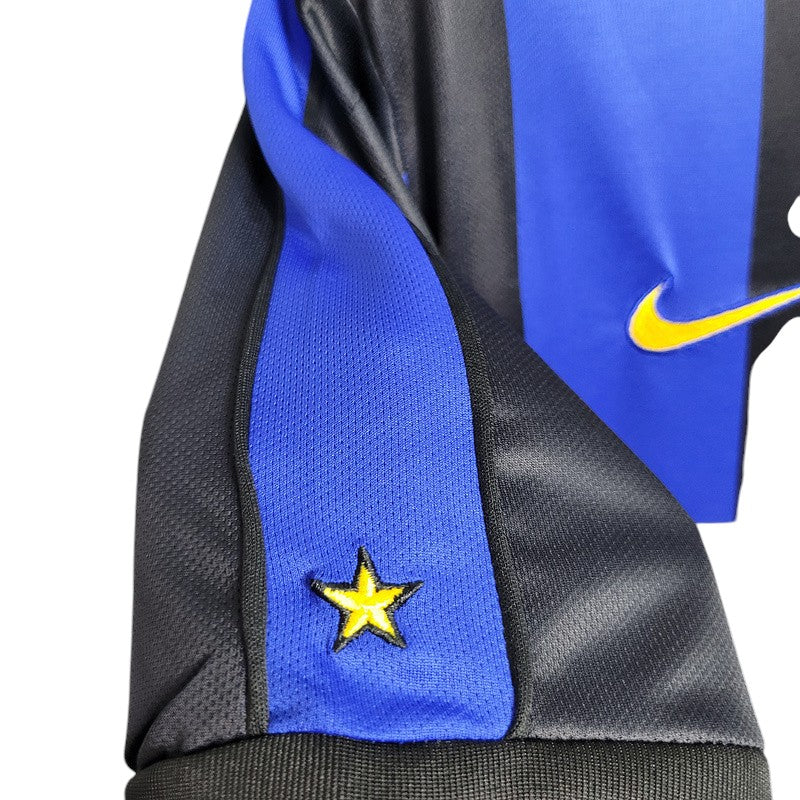 La camiseta del Inter de Milán 1999/00 es un clásico atemporal, con su tradicional diseño de rayas negras y azules, el patrocinio de Pirelli y detalles en dorado en el logo de Nike y el escudo del club. Esta equipación fue utilizada en una temporada llena de altibajos para el Inter, con la llegada de estrellas como Christian Vieri y Clarence Seedorf, además de la participación de figuras como Javier Zanetti y Ronaldo Nazário, quien desafortunadamente sufrió una grave lesión. Un diseño icónico de finales de los 90 que sigue siendo una pieza imprescindible para los coleccionistas y fanáticos interistas.