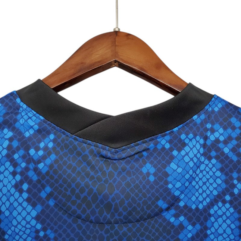 La camiseta del Inter de Milán 2021/22 presenta un diseño innovador que rompe con la tradición, incorporando un patrón de piel de serpiente en tonos azules y negros, inspirado en el icónico Biscione, símbolo del club. Este uniforme marcó una nueva era para el Inter, ya que fue el primero sin el patrocinio de Pirelli después de más de 25 años, y también estrenó el nuevo escudo del club. Usada por figuras como Lautaro Martínez, Nicolò Barella y Hakan Çalhanoğlu, esta equipación acompañó al equipo en la conquista de la Supercopa de Italia y la Coppa Italia, reafirmando su dominio en el fútbol italiano. Un diseño audaz y moderno que es imprescindible para los fanáticos Nerazzurri.