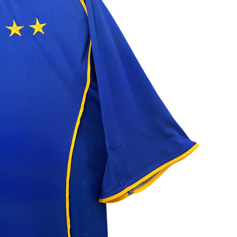 La Juventus 2004-2005 presentó esta segunda equipación azul con detalles en amarillo, fabricada por Nike y con Sky Sport como patrocinador. Este diseño destaca por su estética limpia y moderna, con un contorno amarillo que resalta el escudo del club y las dos estrellas, representando sus múltiples títulos de Serie A. Usada en partidos como visitante, fue vestida por figuras legendarias como Del Piero, Nedvěd, Trezeguet e Ibrahimović, en una temporada donde la Vecchia Signora se coronó campeona de Italia bajo el mando de Fabio Capello.