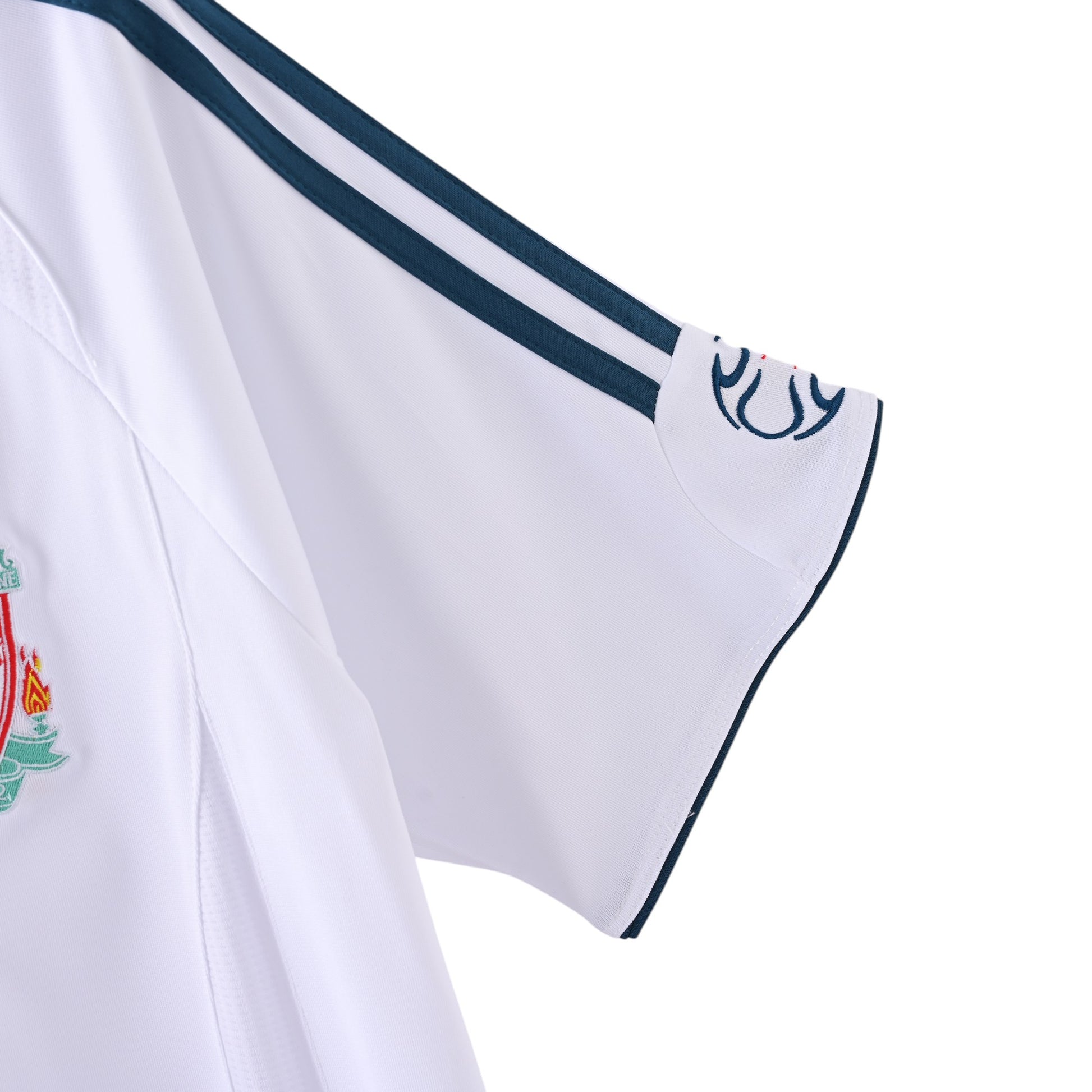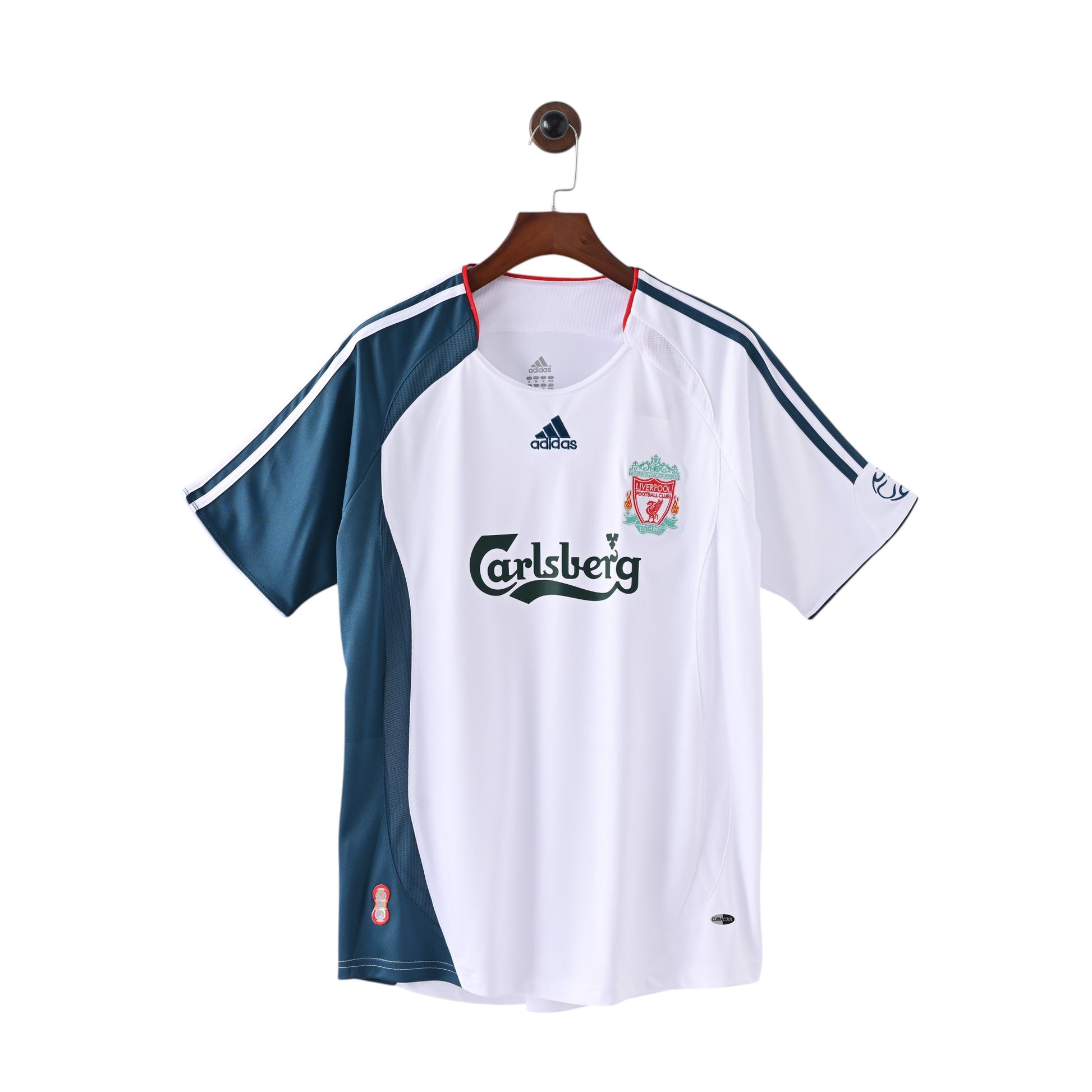 Estilo limpio y moderno con esencia europea. La segunda equipación del Liverpool 2007/08, en blanco con detalles en verde oscuro, fue la compañera de los Reds en su camino a las semifinales de la Champions League. Con el patrocinio de Carlsberg y el escudo bordado, esta camiseta fue usada por figuras como Gerrard, Torres y Mascherano en una temporada cargada de emoción. Ideal para los que recuerdan la época dorada bajo Rafa Benítez.