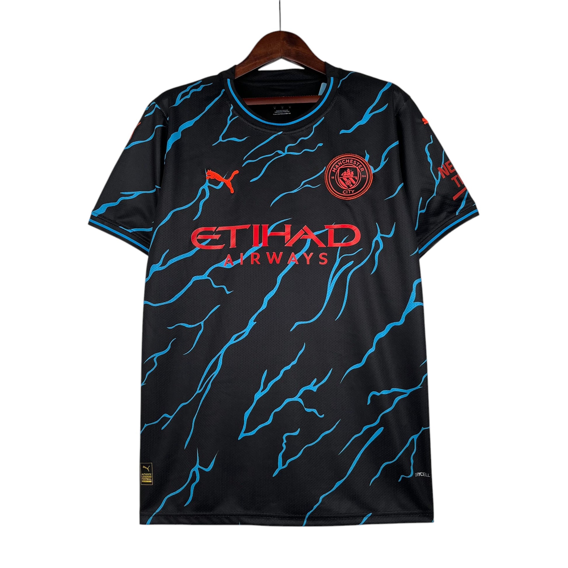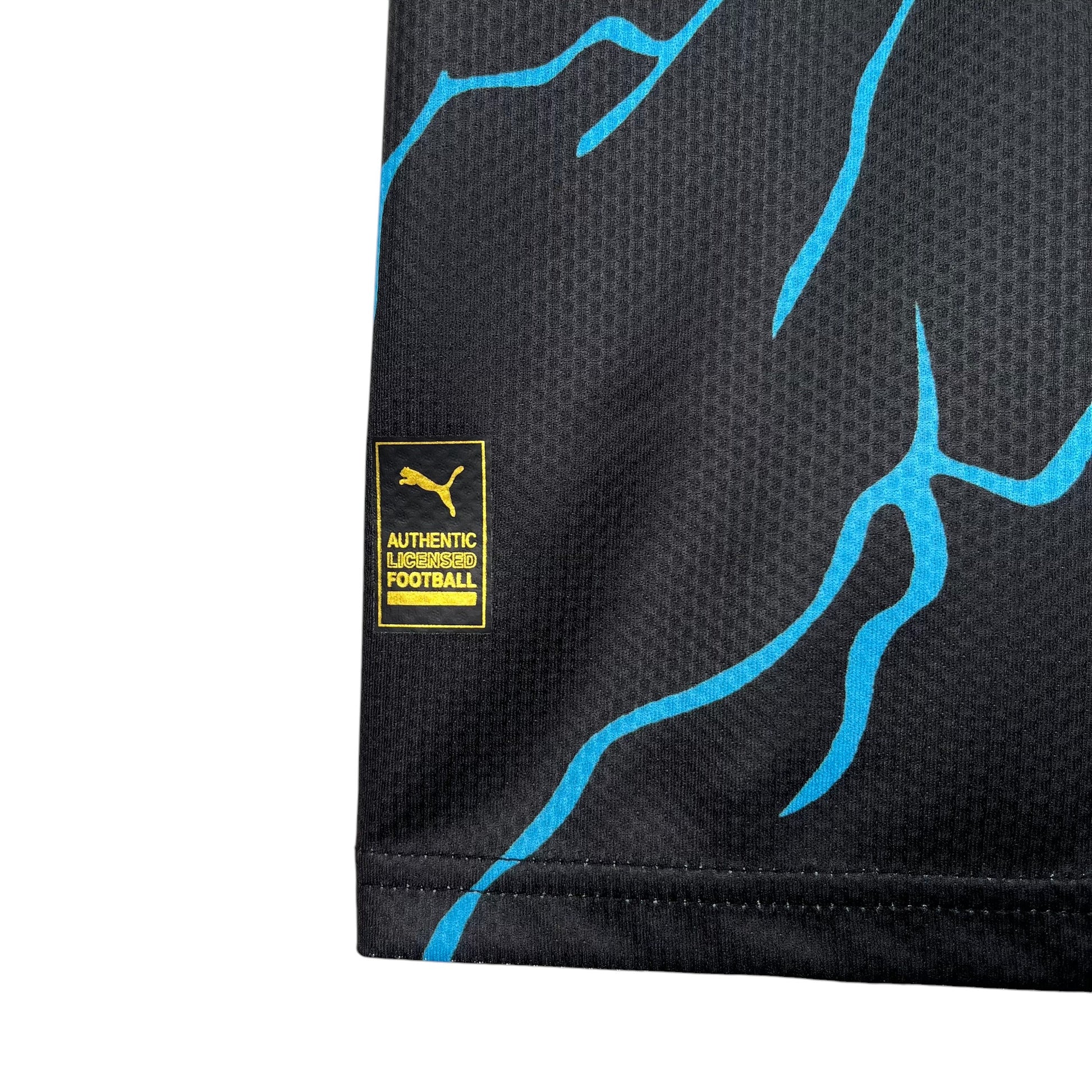 La tercera equipación del Manchester City 2023/24, diseñada por Puma, presenta un audaz diseño en negro con un impactante patrón de relámpagos en azul y detalles en rojo. Inspirada en la energía y el dinamismo del equipo, esta camiseta simboliza el estilo de juego eléctrico de los "Sky Blues". En esta temporada, el City busca seguir dominando el fútbol europeo con figuras como Erling Haaland, Kevin De Bruyne y Phil Foden, mientras defienden su triplete histórico.