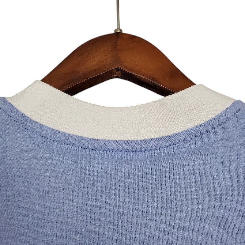 Una auténtica joya para los fanáticos del Manchester City. Esta camiseta retro de 1972, con su diseño minimalista en celeste con cuello y mangas en blanco, refleja la esencia clásica del club. En aquellos años, los "Sky Blues" eran dirigidos por Malcolm Allison y contaban con leyendas como Colin Bell, Francis Lee y Mike Summerbee, quienes llevaron al equipo a competir en la élite del fútbol inglés.