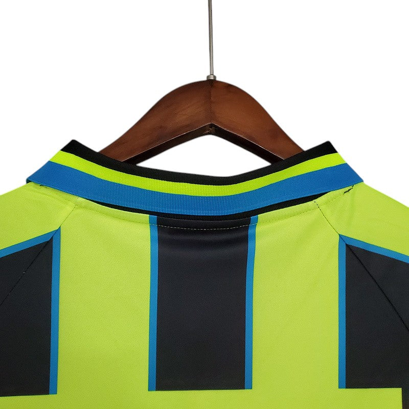 Una de las camisetas más icónicas del Manchester City, la segunda equipación de la temporada 1998/99, diseñada por Kappa, con su atrevido diseño en negro y amarillo fluorescente. Este uniforme es recordado por la dramática final del playoff de ascenso a la First Division (hoy Championship), cuando el City venció al Gillingham en Wembley en un partido épico. Con goles agónicos de Kevin Horlock y Paul Dickov, los "Sky Blues" lograron una remontada histórica y sellaron su regreso a la élite del fútbol inglés.