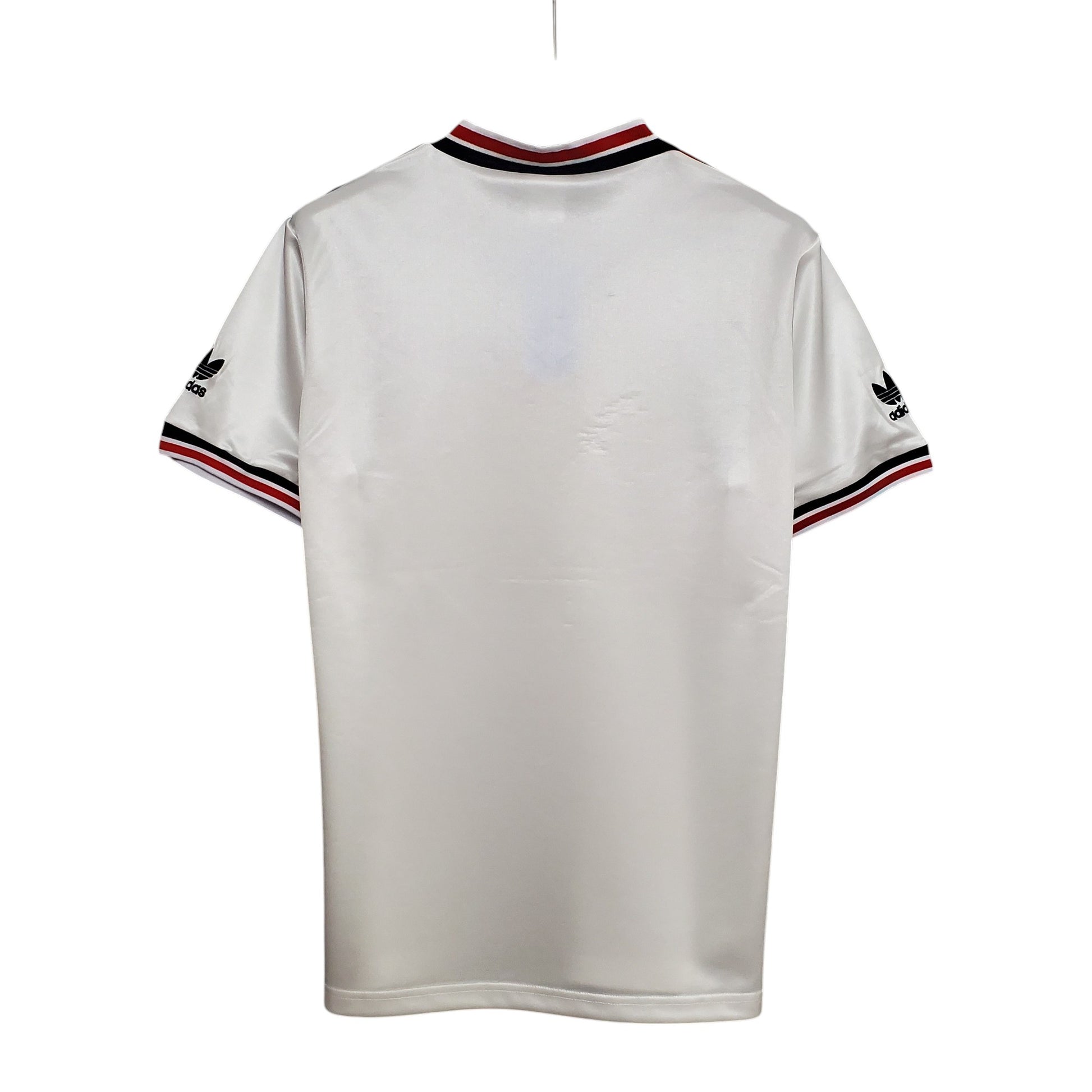 Esta icónica camiseta del Manchester United de la temporada 1985/86 en su versión de visitante destaca por su elegante combinación en blanco con detalles en negro y rojo. Fabricada por Adidas y patrocinada por Sharp, esta equipación fue utilizada en partidos históricos fuera de casa por los Red Devils. Su diseño con cuello en V y mangas con detalles contrastantes la convierten en una pieza de colección para los fanáticos del club.