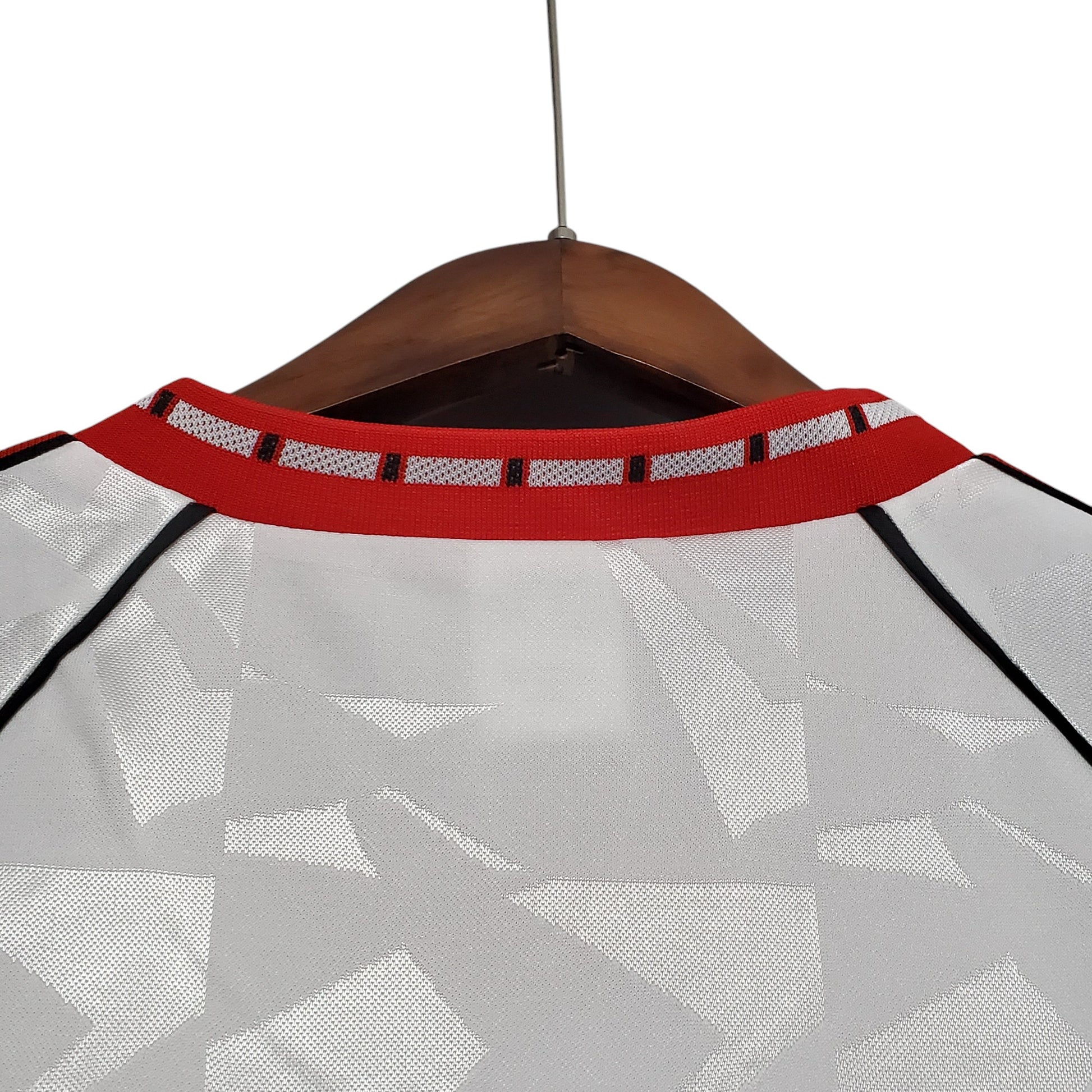 La segunda equipación del Manchester United en la temporada 1990/91 es una de las más recordadas de la era Adidas. Con su elegante diseño blanco con patrones geométricos en el tejido, detalles en rojo y negro en las mangas y el icónico escudo del club bordado, esta camiseta fue testigo de la histórica victoria del United en la Recopa de Europa de 1991 contra el FC Barcelona. Usada por figuras legendarias como Mark Hughes y Bryan Robson, esta pieza es un símbolo del resurgimiento del club en competiciones europeas.
