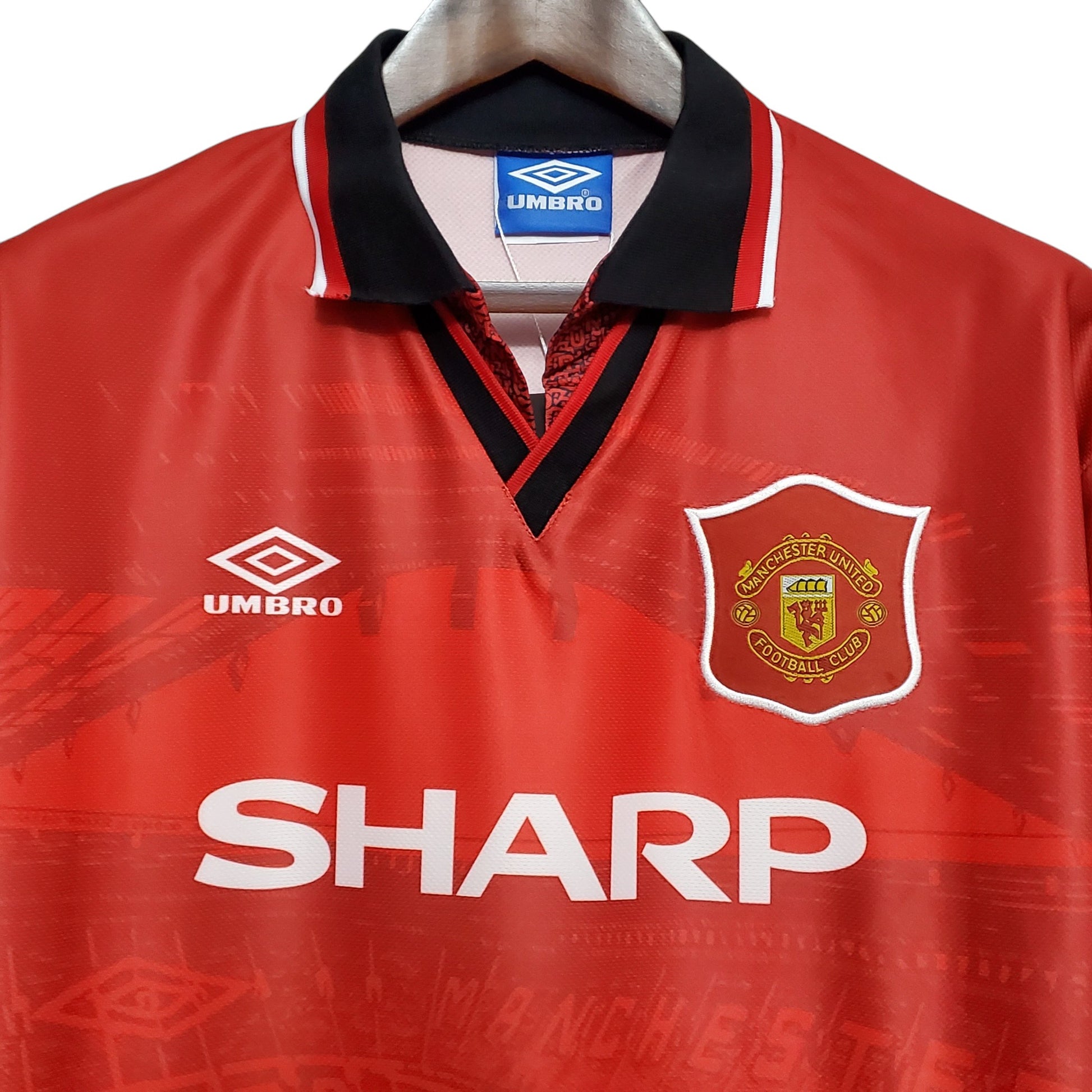 Esta camiseta es un clásico absoluto del Manchester United en los años dorados de la Premier League. Confeccionada por Umbro y patrocinada por Sharp, la equipación local de la temporada 1994-1996 destaca por su diseño con detalles sublimados que incluyen el nombre del club y el escudo en relieve. Fue utilizada por leyendas como Eric Cantona, Ryan Giggs y Paul Scholes en una era de dominio del United en Inglaterra.