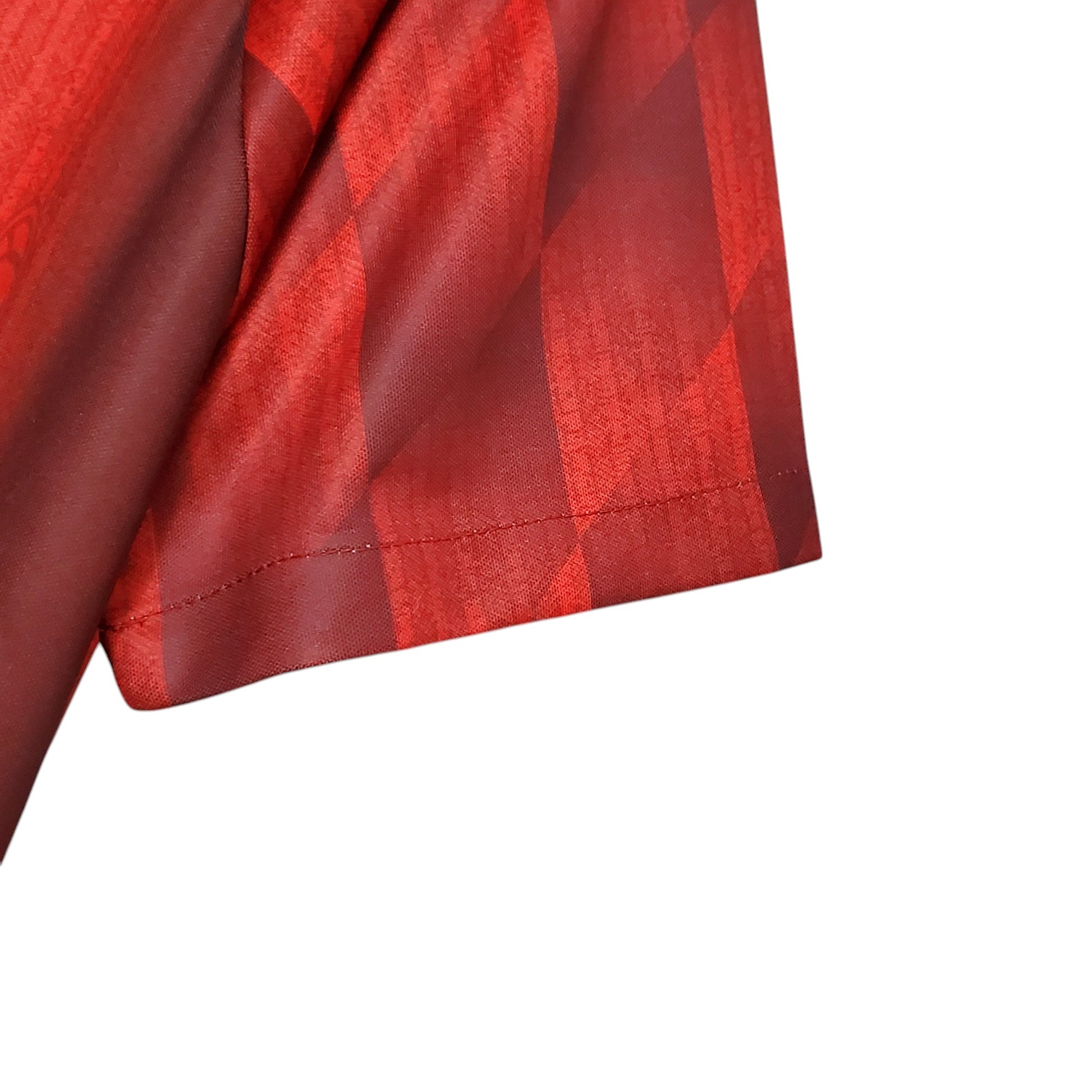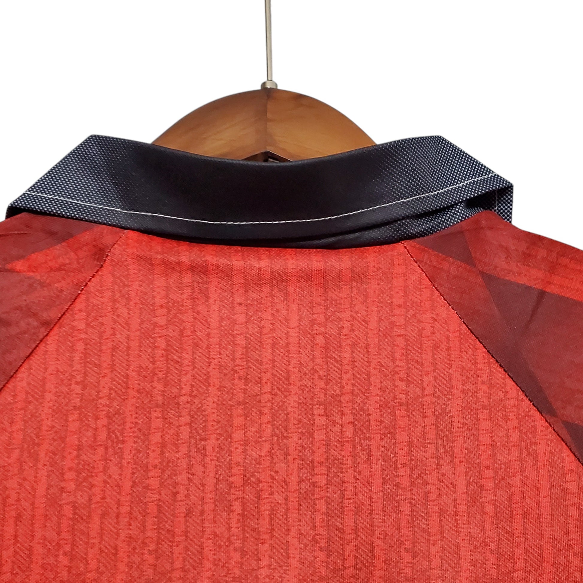 La camiseta de local del Manchester United de la temporada 1996-1997, fabricada por Umbro y patrocinada por Sharp, es una de las más icónicas de los años 90. Con un diseño innovador que incorpora un patrón sombreado y detalles en negro en las mangas, esta equipación rinde homenaje al "Teatro de los Sueños" con su distintiva inscripción en la parte inferior. Fue utilizada por leyendas como Eric Cantona, David Beckham y Ryan Giggs en una de las etapas más gloriosas del club bajo la dirección de Sir Alex Ferguson.