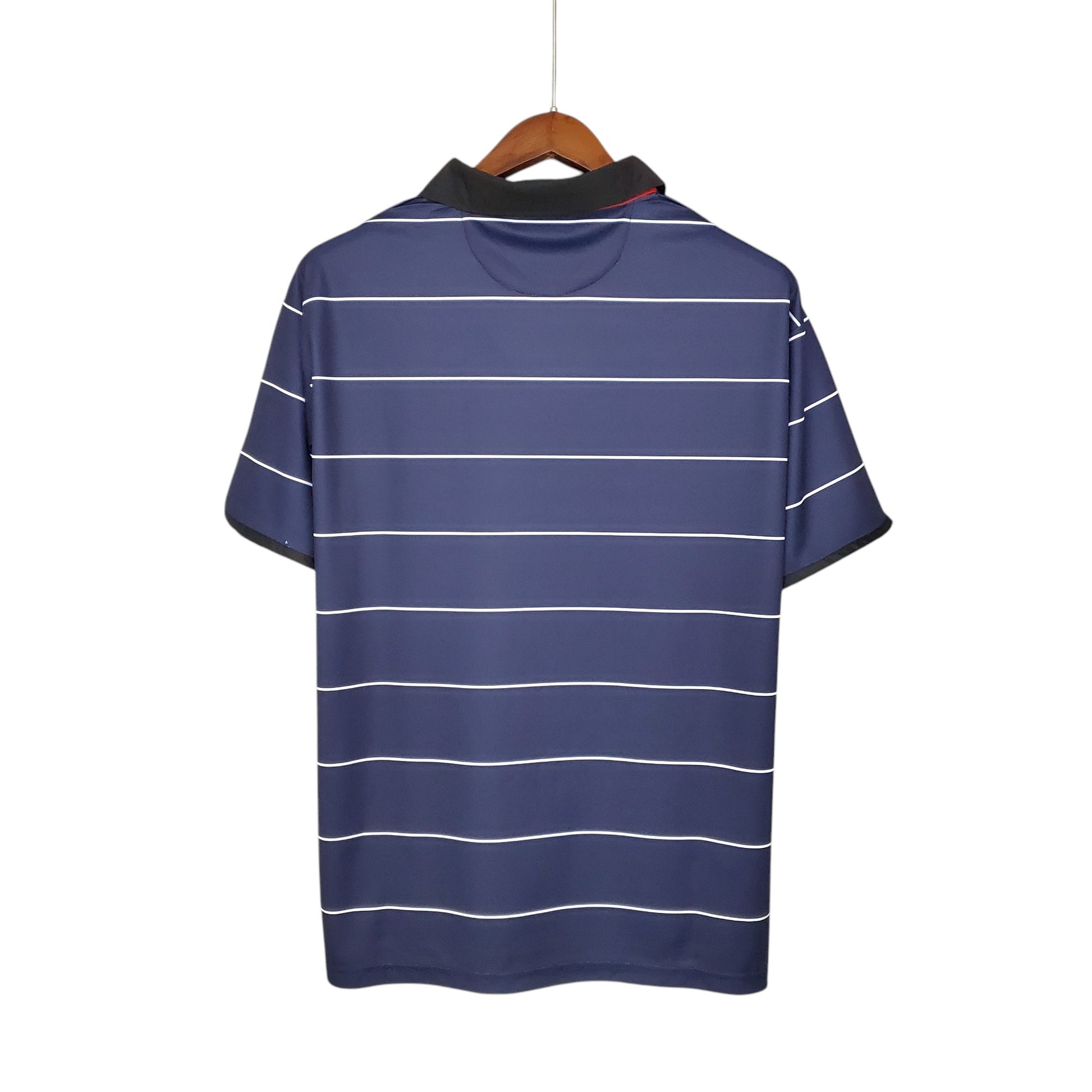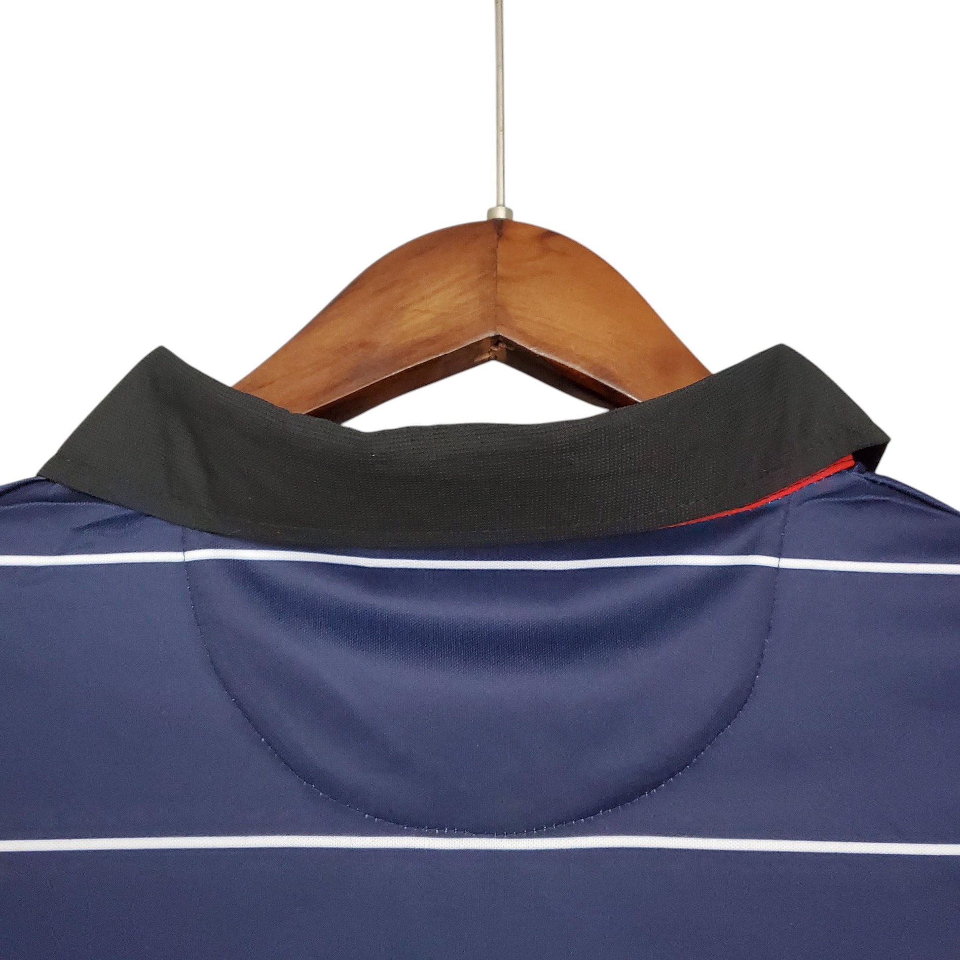 Esta icónica tercera equipación del Manchester United de la temporada 1999-2000, fabricada por Umbro y con el patrocinio de Sharp Digital, es una de las más recordadas por los fanáticos de los Red Devils. Con su elegante diseño en azul marino con finas líneas blancas y el escudo monocromático, esta camiseta fue utilizada por leyendas como David Beckham, Ryan Giggs y Roy Keane en un período glorioso para el club, tras haber conquistado el triplete en la temporada anterior. Un verdadero símbolo de una era dorada en la historia del United y una prenda imprescindible para los coleccionistas.