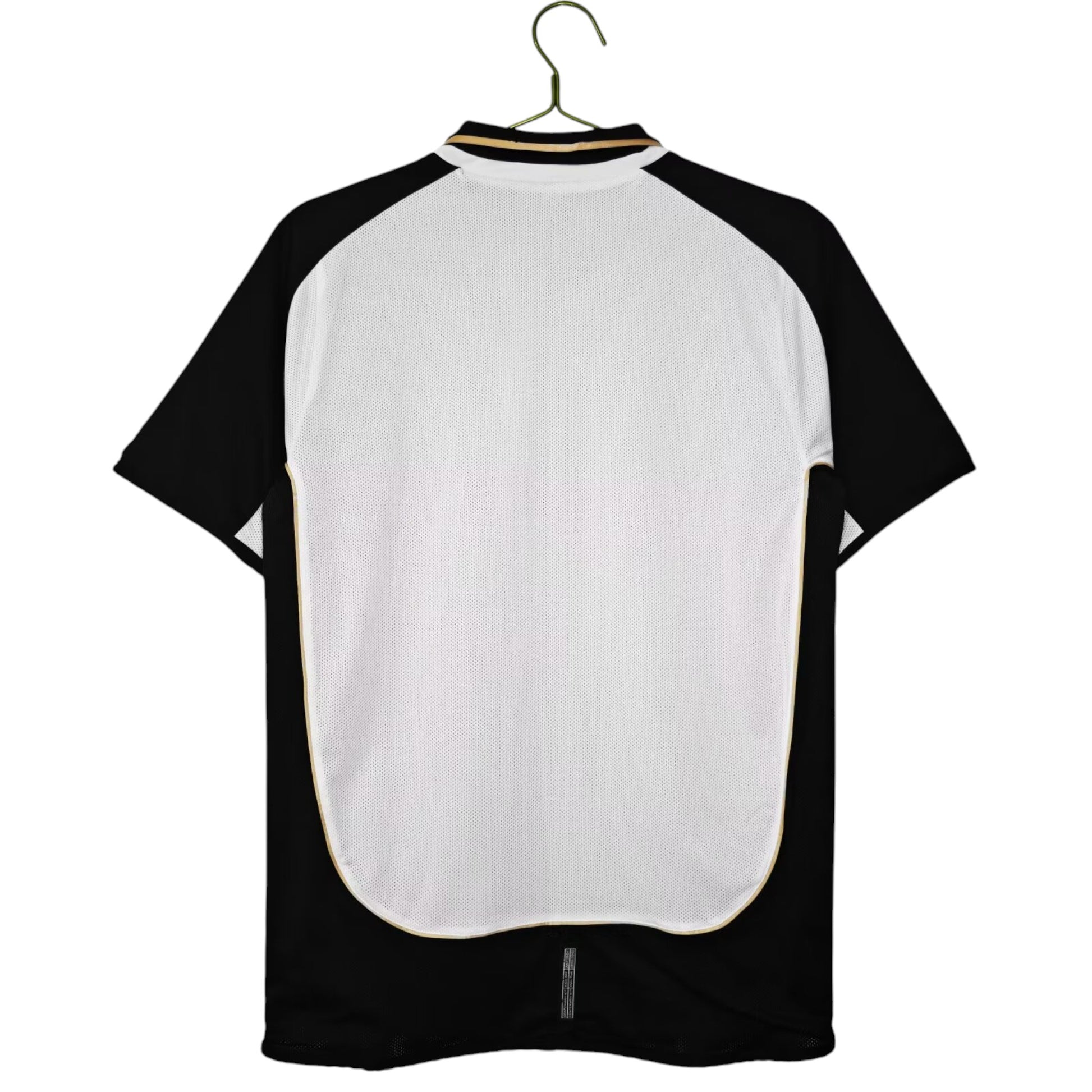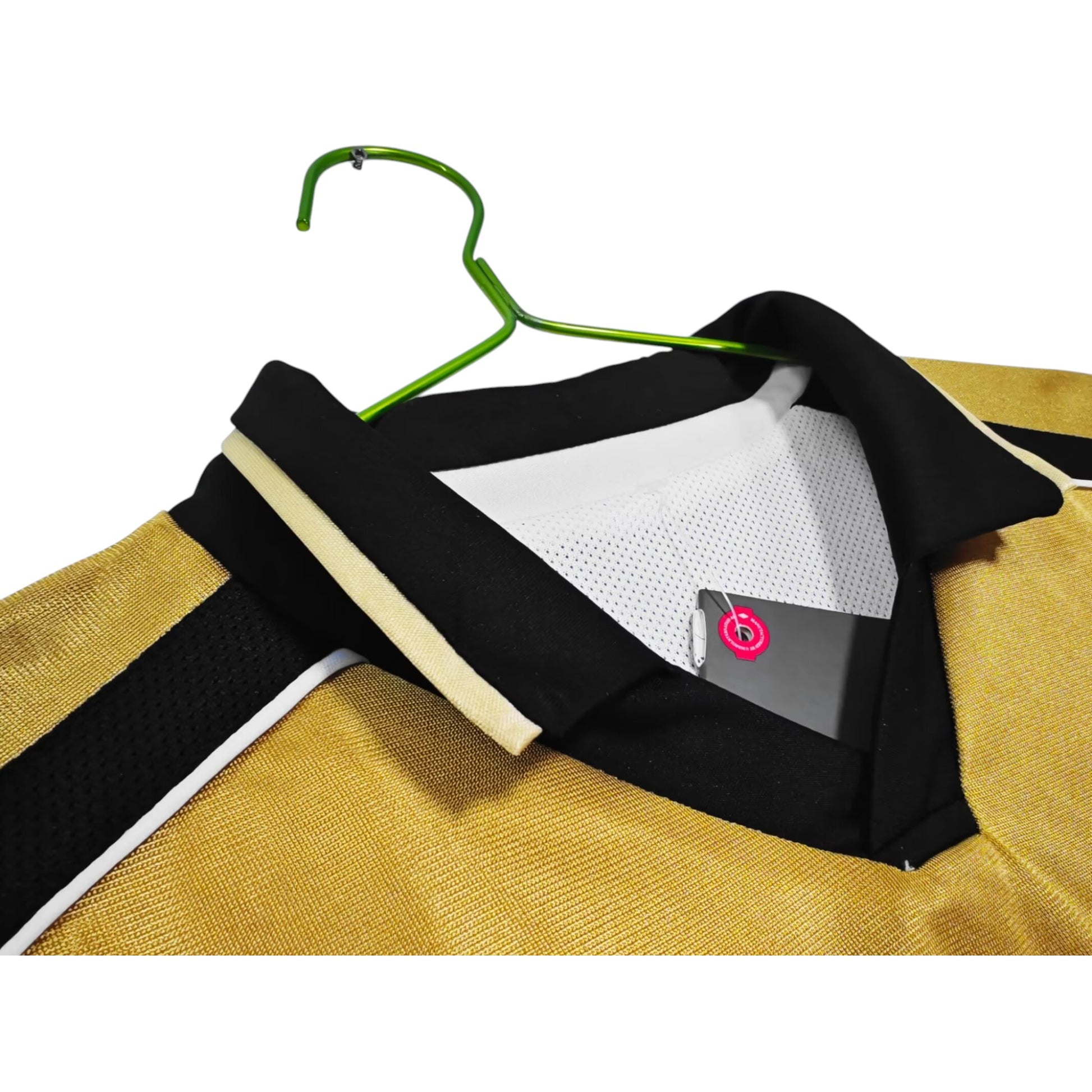 Esta icónica camiseta dorada del Manchester United de la temporada 2001/02 es una de las más distintivas en la historia del club. Fabricada por Umbro y patrocinada por Vodafone, destaca por su innovador diseño reversible, lo que la hace única entre las equipaciones de los Red Devils. Su tono dorado con detalles en negro simboliza la grandeza y el éxito del equipo en esa época. Usada en partidos específicos, es una prenda de colección para los verdaderos aficionados del United.