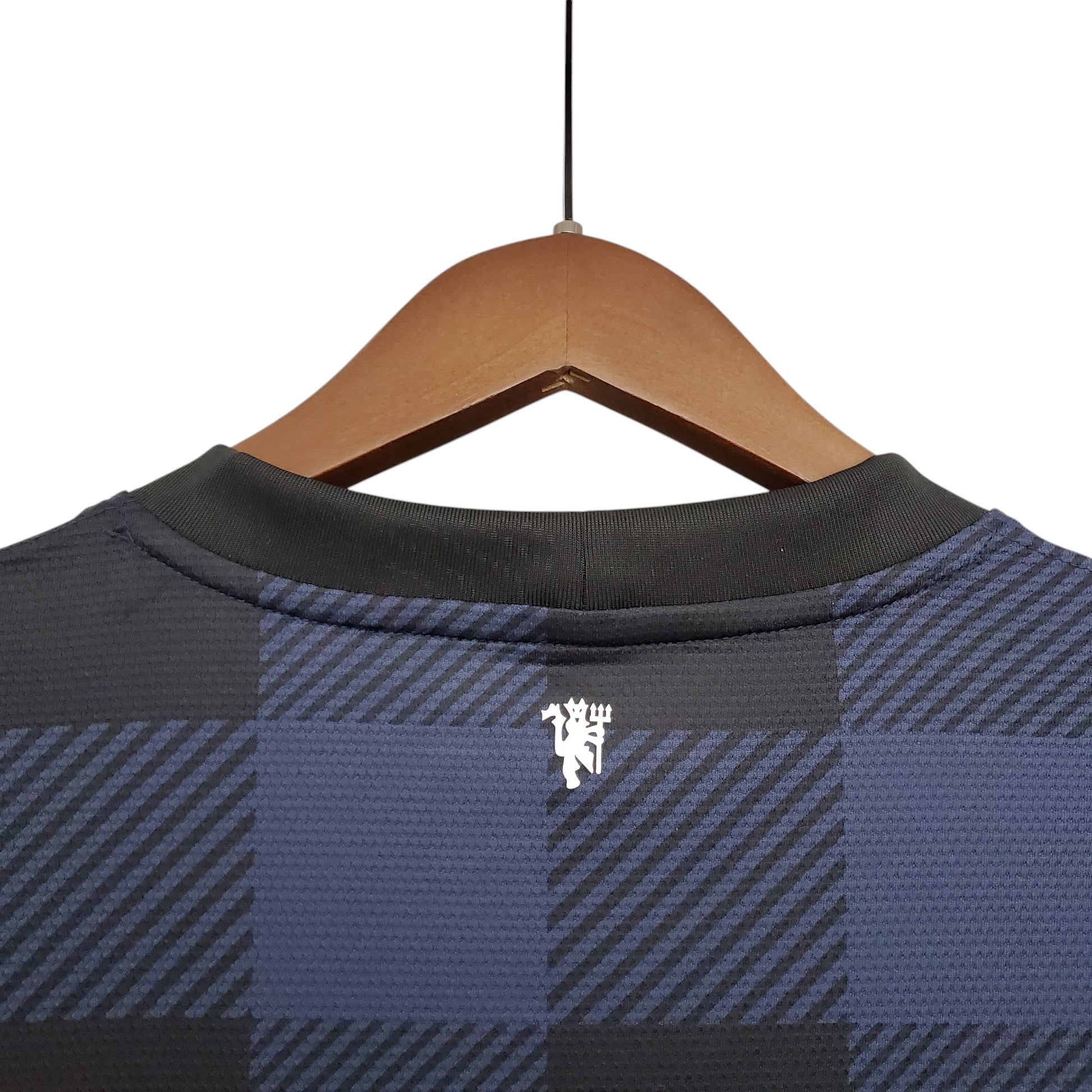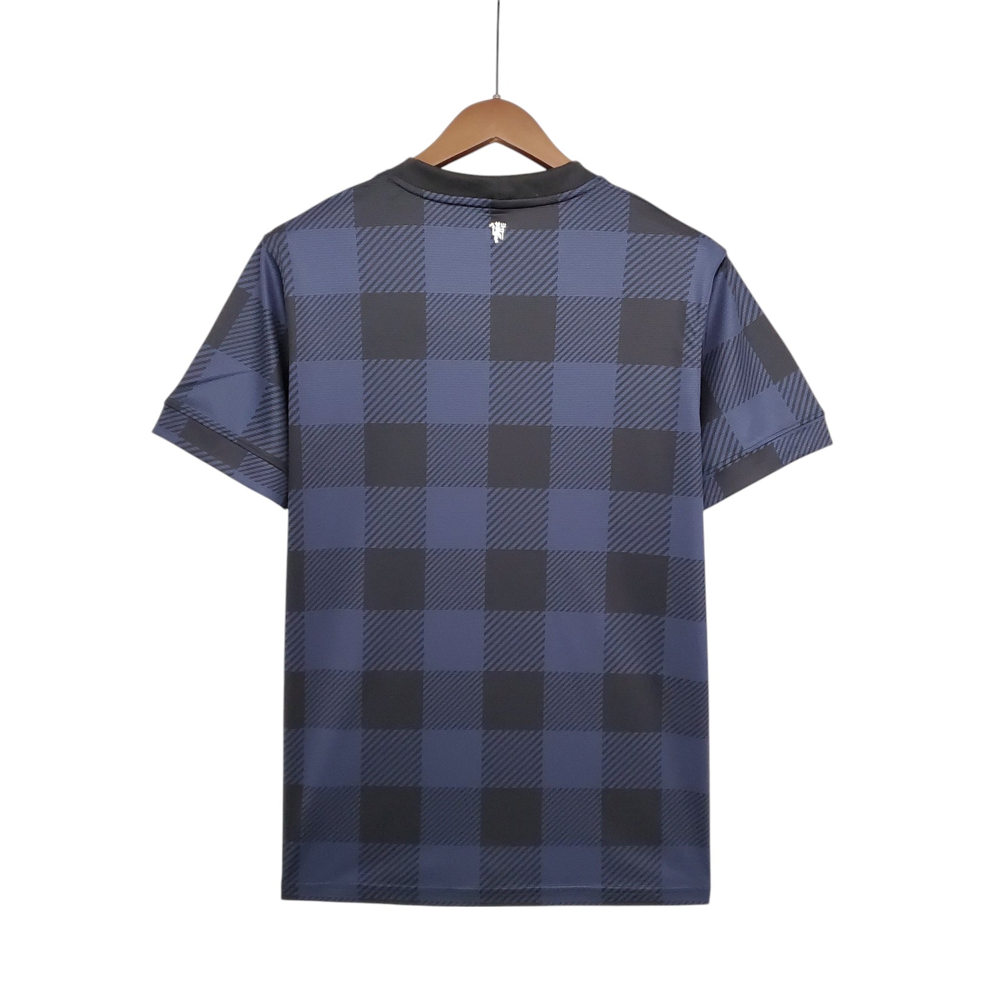 Esta llamativa tercera equipación del Manchester United para la temporada 2013/14 presenta un diseño a cuadros en tonos azul y negro, inspirado en la herencia escocesa del club. Fabricada por Nike y con AON como patrocinador principal, esta camiseta fue una de las más distintivas de la época. Su escudo monocromático en azul oscuro le da un toque moderno y elegante.