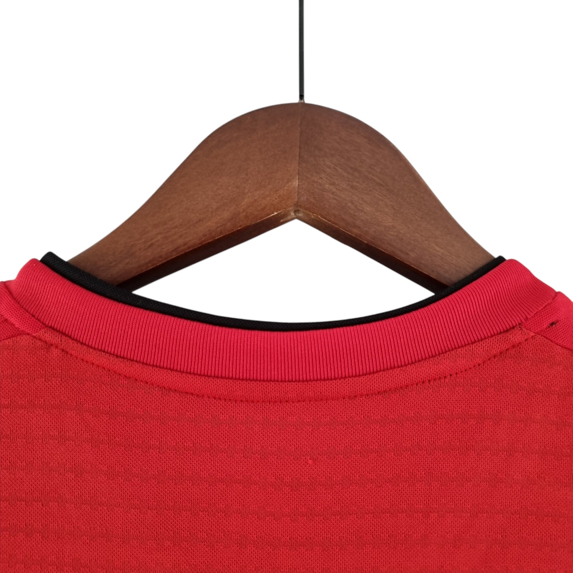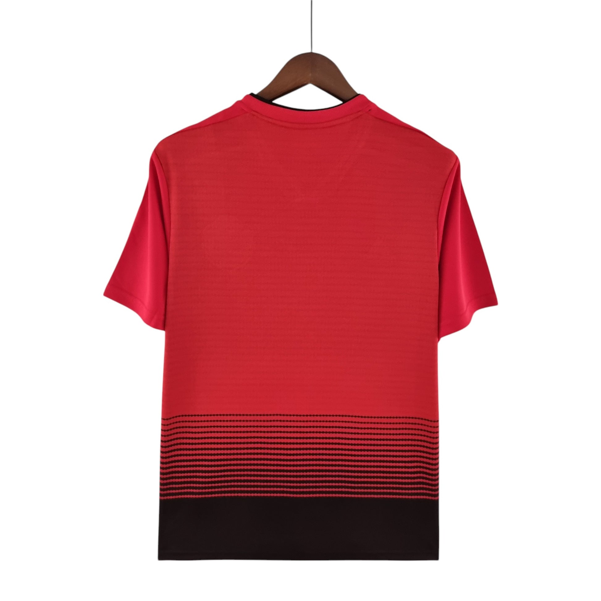 La equipación titular del Manchester United para la temporada 2018/19 presenta un diseño moderno con un degradado en la parte inferior que simboliza los raíles ferroviarios, en homenaje a los orígenes del club como Newton Heath, fundado por trabajadores del ferrocarril en 1878. Fabricada por Adidas y patrocinada por Chevrolet, esta camiseta destaca por su combinación de rojo vibrante con detalles en negro en los hombros y la parte baja.