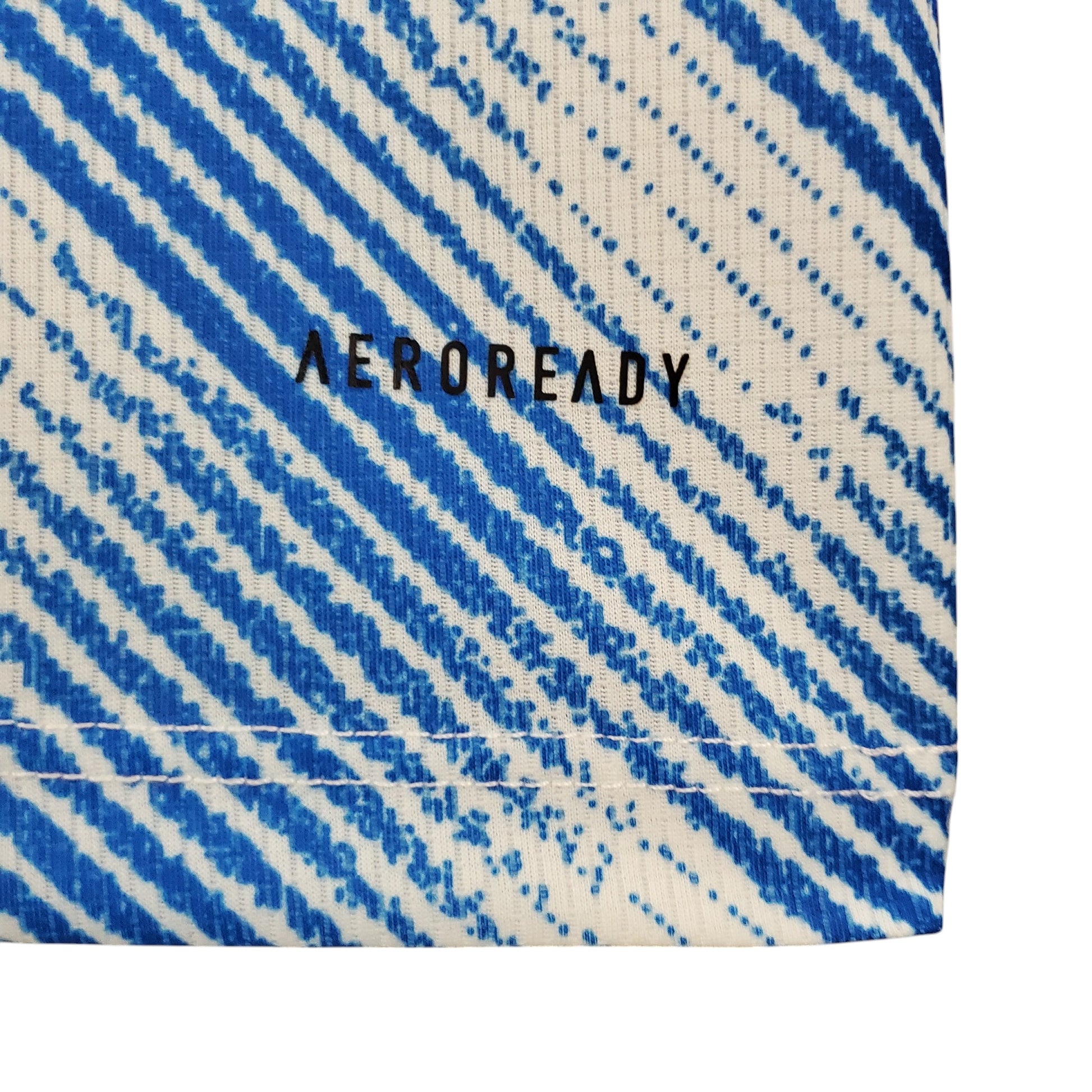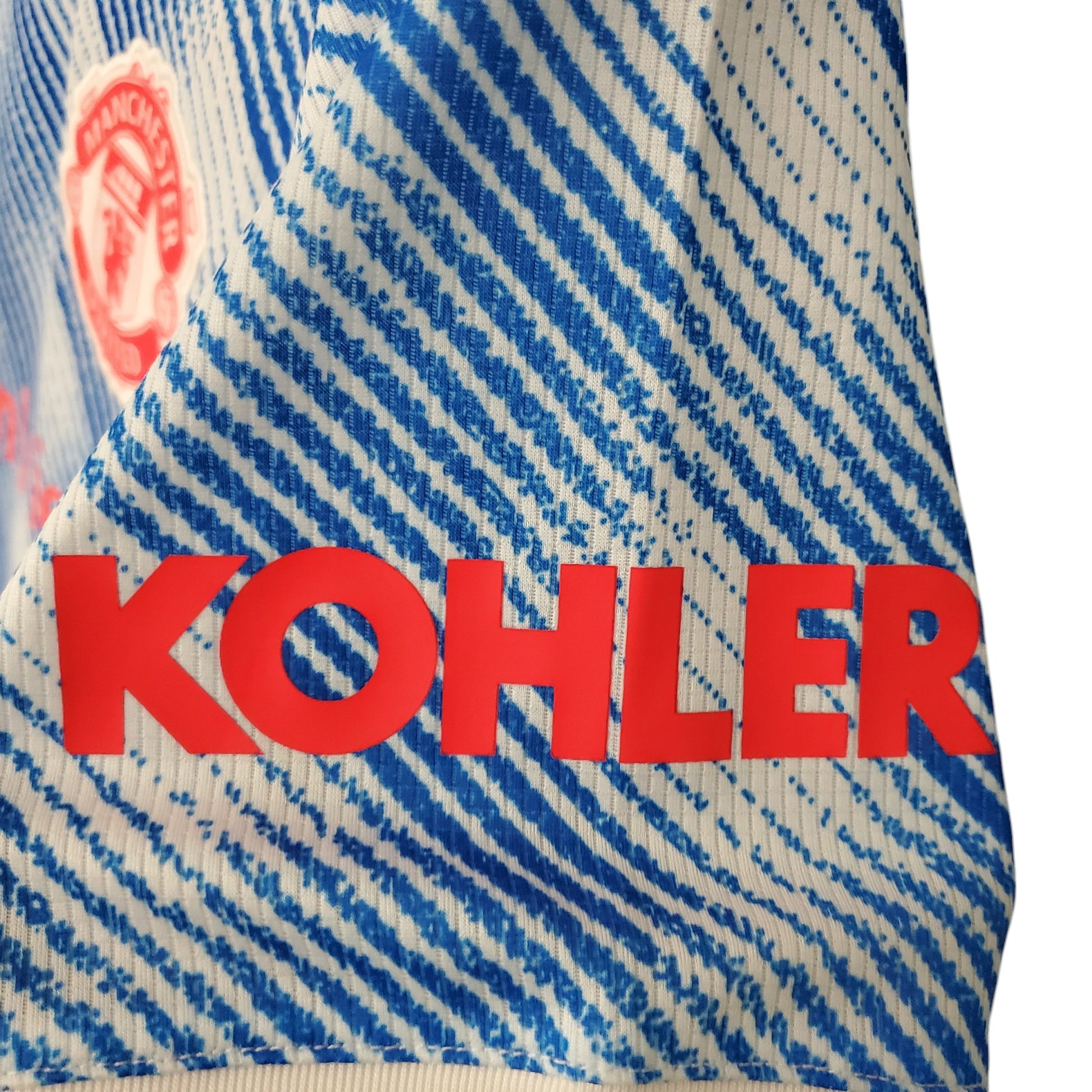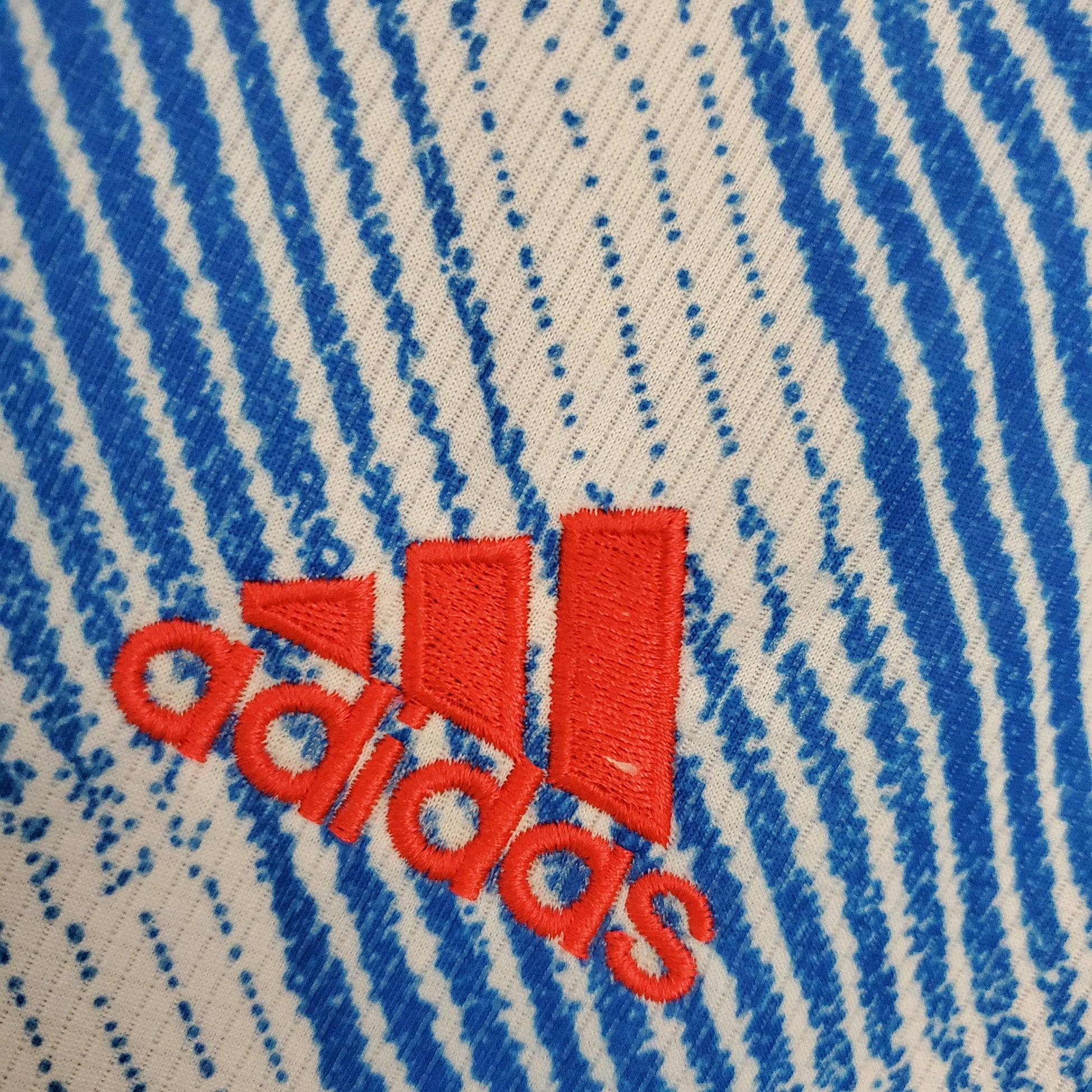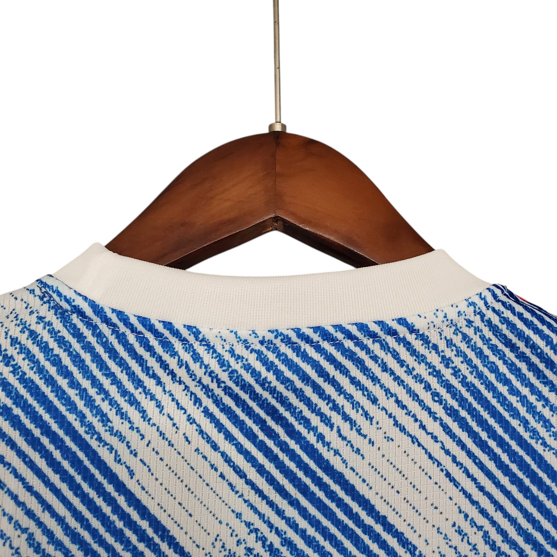 La segunda equipación del Manchester United para la temporada 2021/22, diseñada por Adidas, rinde homenaje a la icónica camiseta de la temporada 1990/92. Presenta un diseño en azul y blanco con un patrón gráfico dinámico, acompañado de detalles en rojo, como el logo de Adidas y el patrocinador TeamViewer. El escudo del club también destaca con un fondo rojo, resaltando la identidad del equipo. Utilizada en partidos de la Premier League y competiciones europeas, esta camiseta combina un estilo retro con la innovación tecnológica de Adidas para un rendimiento óptimo.