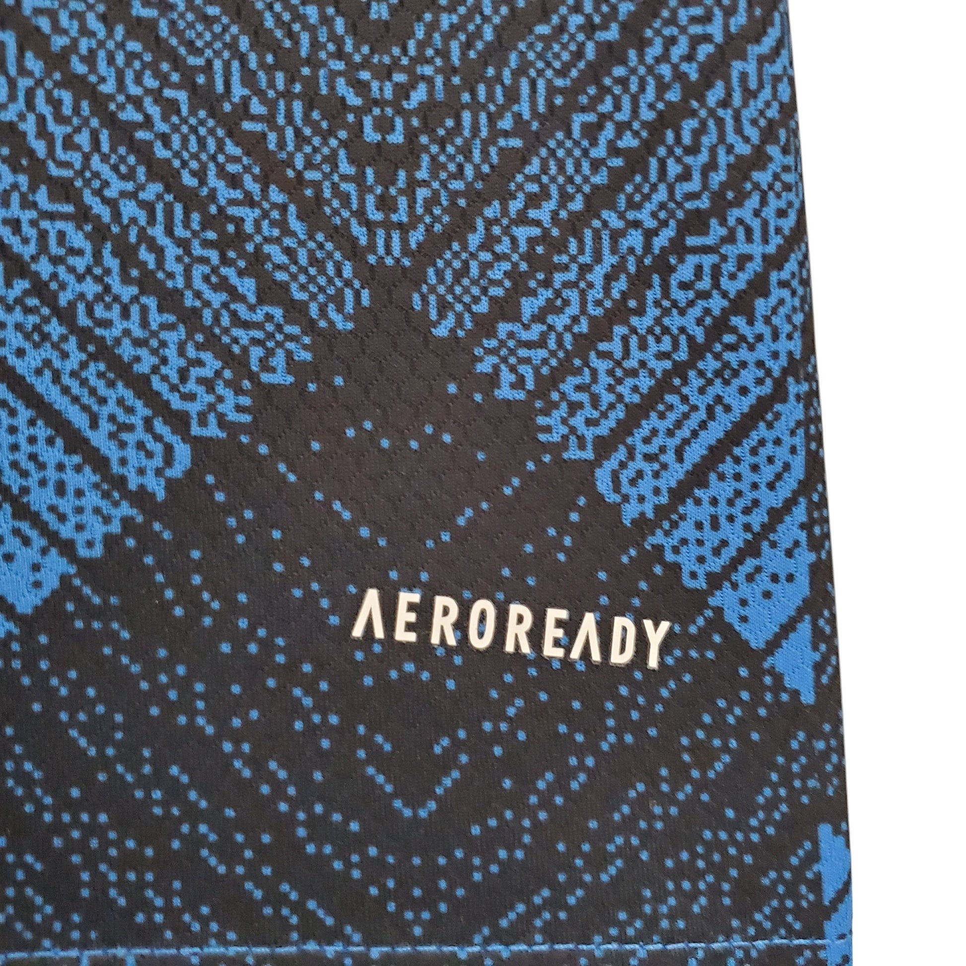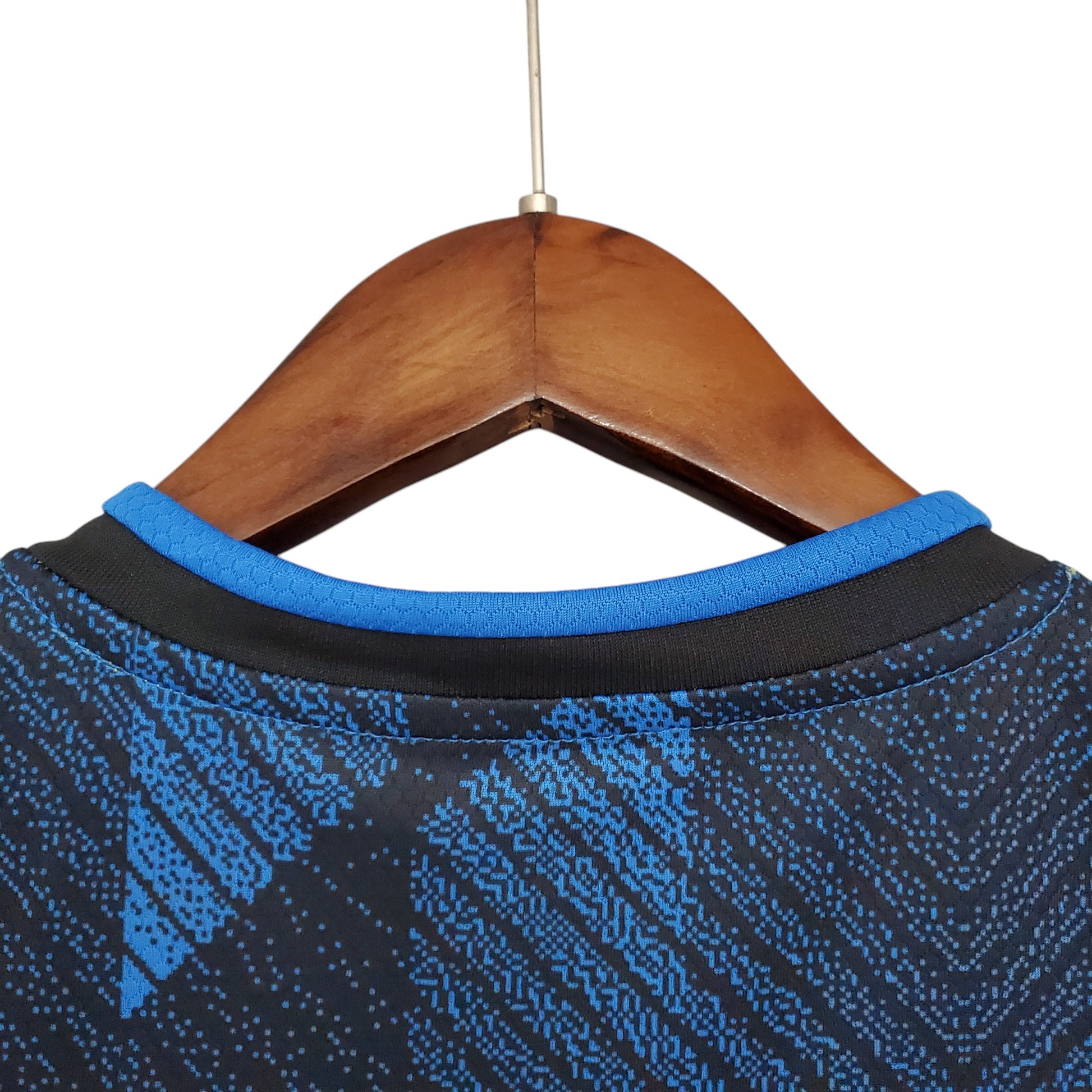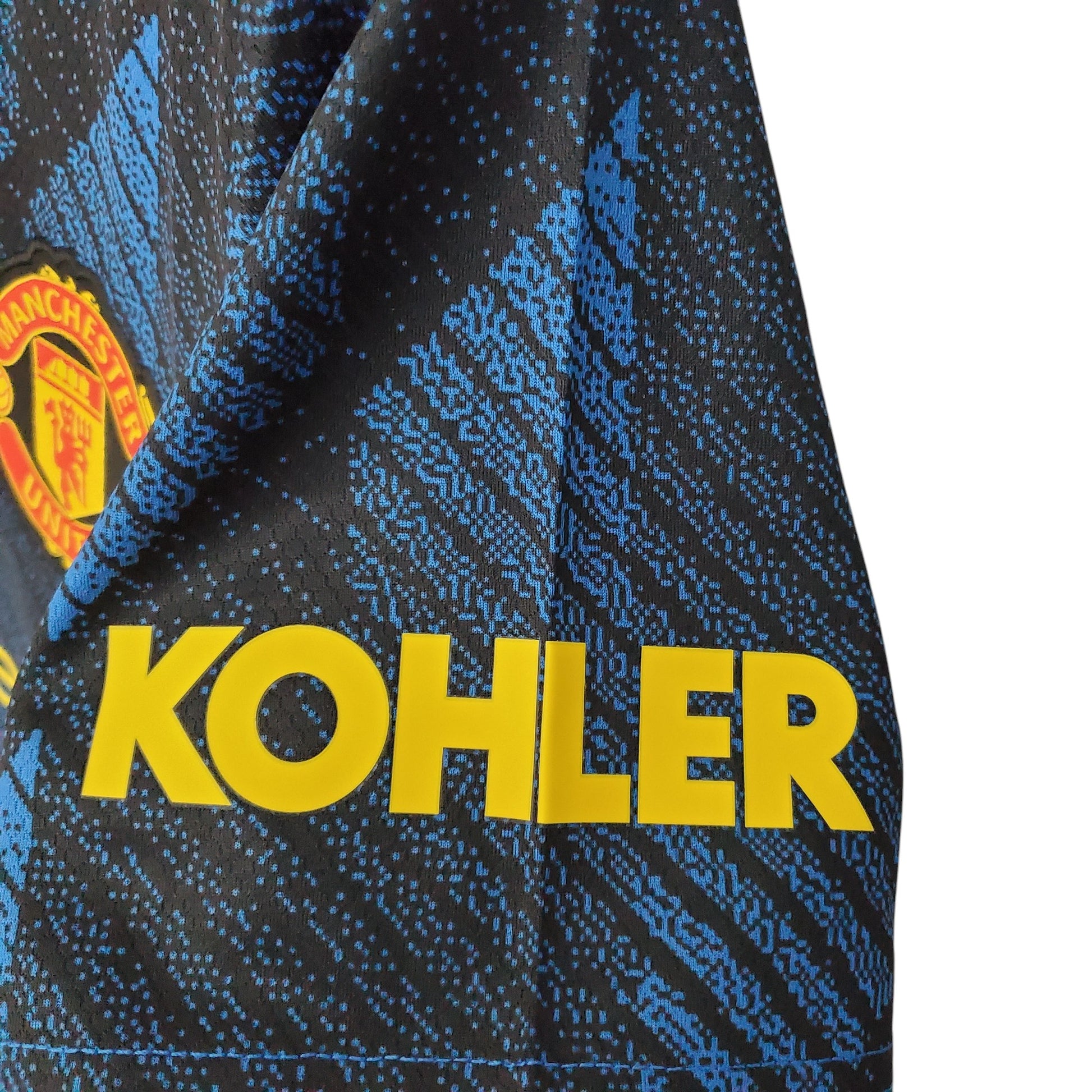 La tercera equipación del Manchester United para la temporada 2021/22, diseñada por Adidas, presenta un diseño moderno con una combinación de azul oscuro y detalles en amarillo vibrante. El patrón geométrico en zigzag recuerda a diseños clásicos de los años 90, mientras que las tres líneas amarillas en los hombros y el patrocinador TeamViewer completan el look. El escudo del club destaca en tonos dorados y rojos, resaltando la identidad de los "Red Devils".