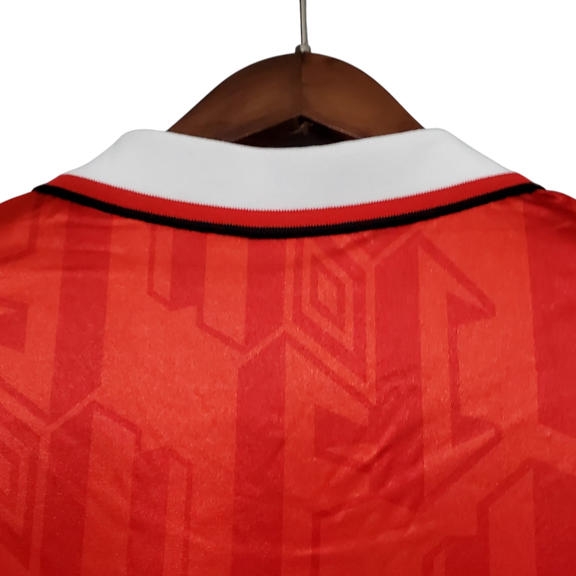 La primera equipación del Manchester United en la temporada 1992-1994, diseñada por Umbro y patrocinada por Sharp, es un símbolo de un momento histórico: el primer título de Premier League en la era moderna. Con su diseño clásico rojo, cuello blanco y cordones vintage, esta camiseta acompañó al equipo dirigido por Sir Alex Ferguson en el inicio de una dinastía dorada. Jugadores legendarios como Eric Cantona, Bryan Robson, Ryan Giggs y Mark Hughes fueron protagonistas de una campaña inolvidable que rompió una sequía de 26 años sin títulos de liga.