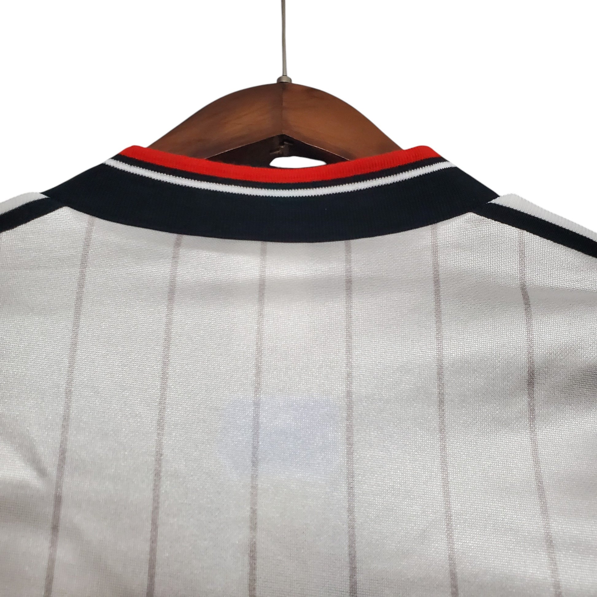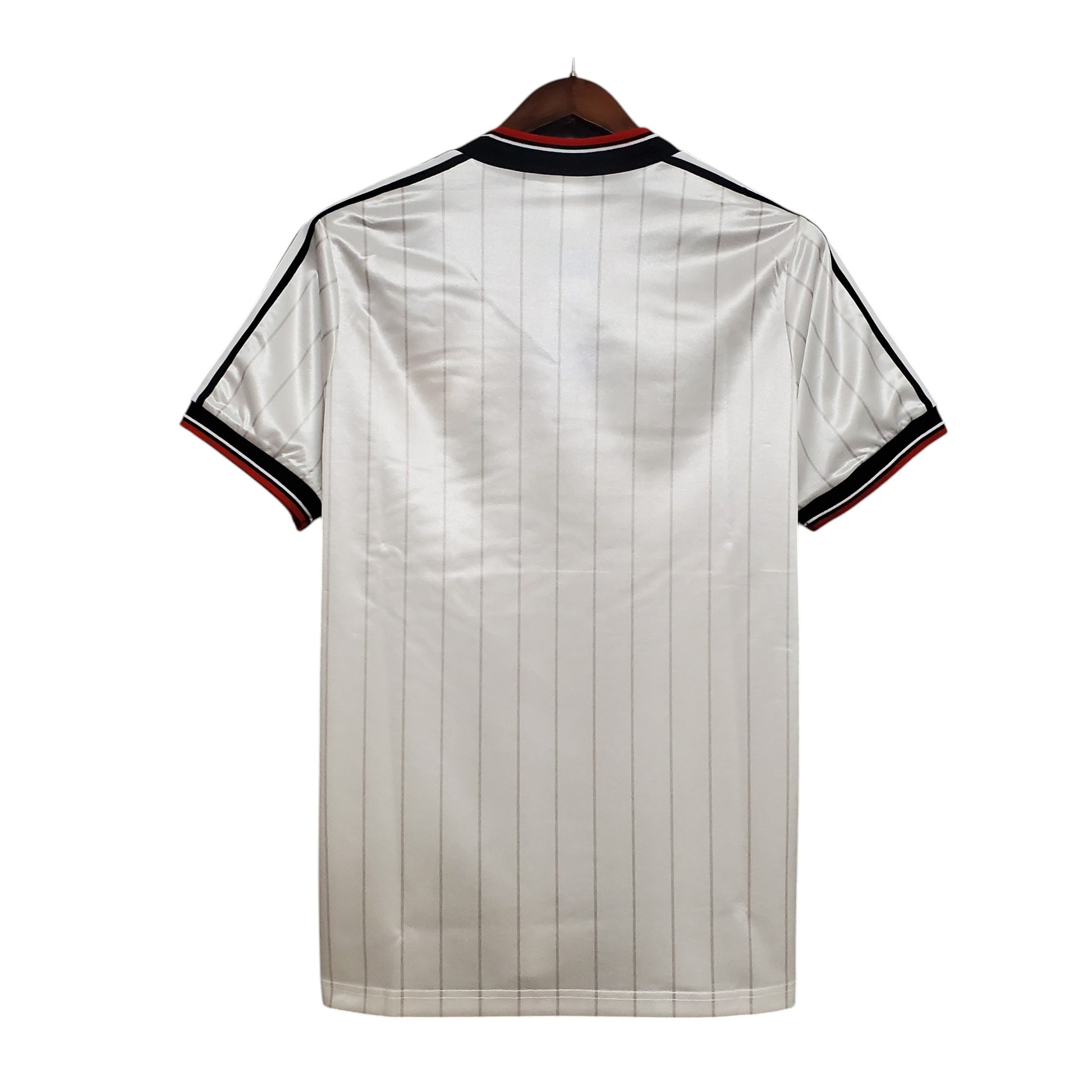 Un diseño clásico y elegante utilizado por los Red Devils en la temporada 1983, cuando el equipo conquistó la FA Charity Shield. Fabricada por Adidas y con el icónico patrocinio de Sharp, esta camiseta blanca con finas líneas verticales y detalles en negro y rojo representa una era dorada del Manchester United. Con el escudo especial de la FA Charity Shield en el pecho, esta equipación es una joya para los fanáticos que desean revivir la historia del club en los años 80.