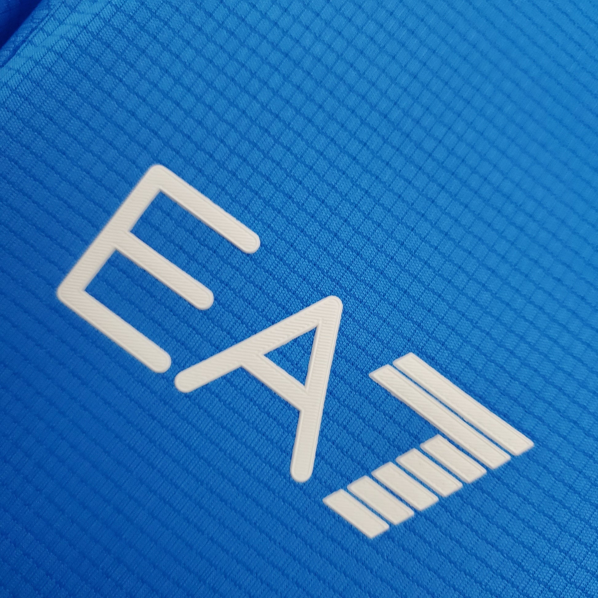 La camiseta del Napoli para la temporada 2021/22, diseñada por EA7, presenta un diseño moderno y elegante en el clásico color azul celeste del club. Con detalles en negro en el cuello y mangas, esta equipación combina un estilo sofisticado con la tradición napolitana. Los patrocinadores "Lete" y "MSC" resaltan en el frente, mientras que el escudo del Napoli y el logo de EA7 completan el diseño. Esta camiseta fue utilizada en la Serie A por jugadores emblemáticos como Lorenzo Insigne y Victor Osimhen.