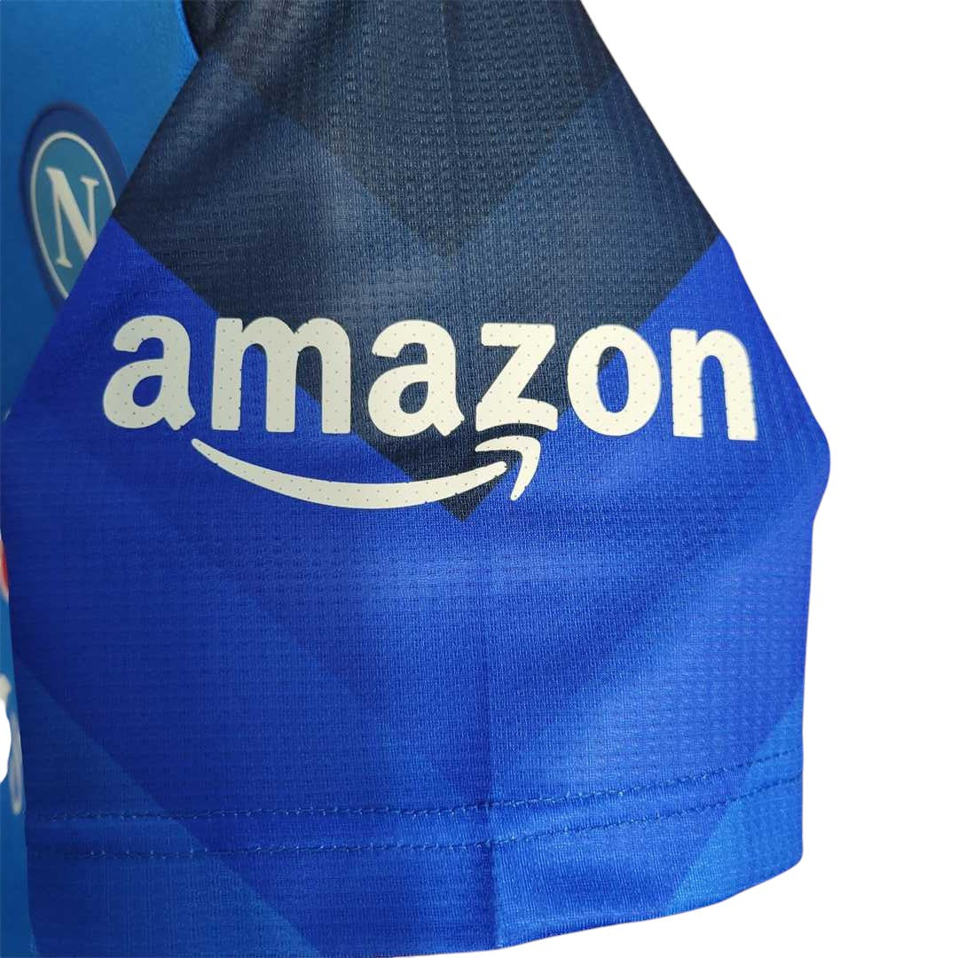 La camiseta titular del Napoli para la temporada 2022/23, diseñada por EA7, combina un tono azul vibrante con mangas en azul marino para un diseño moderno y dinámico. Presenta un patrón sutil en el tejido, el escudo del club en el pecho y los patrocinadores "Lete" y "MSC" en rojo y blanco respectivamente. Esta equipación fue utilizada durante la histórica temporada en la que el Napoli se consolidó como uno de los equipos más destacados de la Serie A y competiciones europeas.