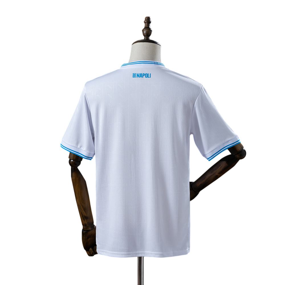 Camiseta blanca del Napoli, con detalles celestes en cuello y mangas que refuerzan la identidad del club. Presenta el escudo en el pecho junto al parche tricolor y el patrocinio MSC, logrando un diseño limpio, moderno y elegante que mantiene el estilo clásico de las presentaciones fuera de casa.