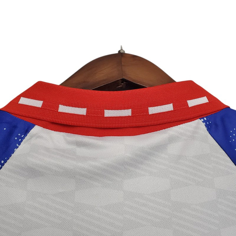 La segunda equipación del Paris Saint-Germain para la temporada 1993-1994 es una de las más llamativas y originales en la historia del club. Con un diseño en blanco con detalles gráficos en azul y rojo, esta camiseta refleja el estilo vibrante de los años 90. Patrocinada por Commodore y Tourtel, y diseñada por Nike, este uniforme acompañó al PSG en una temporada clave en la que el equipo conquistó la Ligue 1, con jugadores como David Ginola y George Weah liderando el ataque.