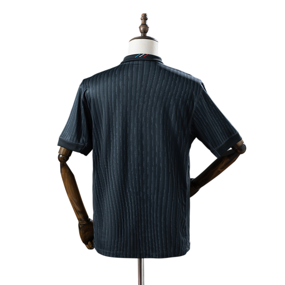 Camiseta negra de la cuarta equipación del Paris Saint-Germain, con diseño elegante y minimalista. Presenta textura a rayas sutiles, línea central en contraste y el escudo del club en el pecho, acompañados por el patrocinio Qatar Airways. Un modelo moderno y sofisticado que refleja la identidad cosmopolita y vanguardista del PSG.