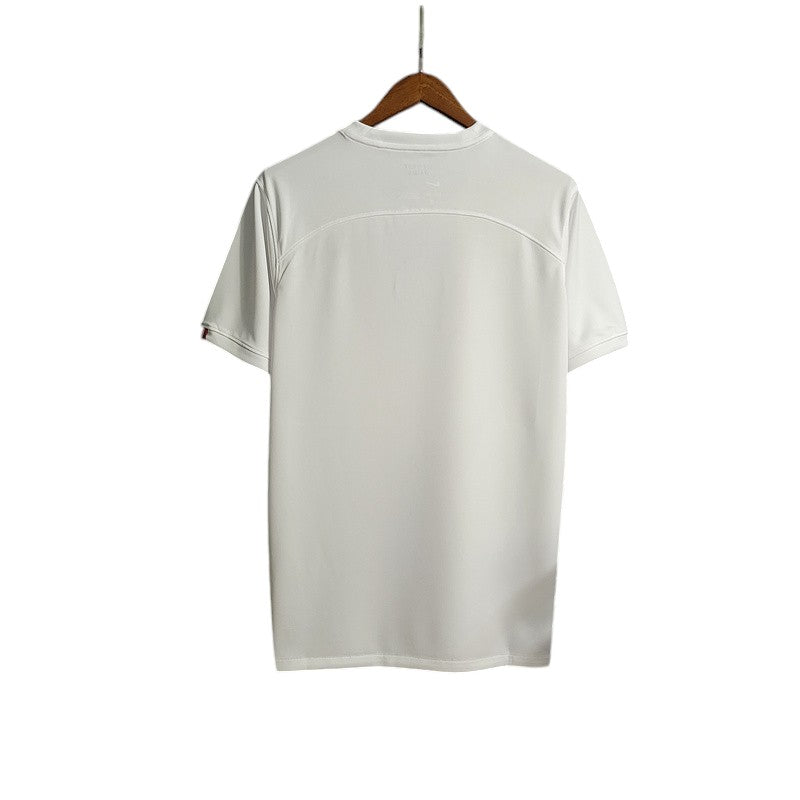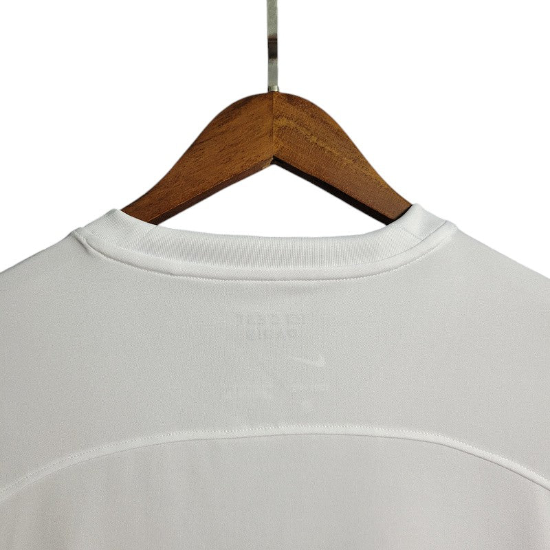 La camiseta blanca del Paris Saint-Germain para la temporada 2022-2023 destaca por su diseño elegante con la franja central en azul y rojo, rindiendo homenaje a la identidad clásica del club. Esta equipación fue testigo de la última temporada de Lionel Messi en el equipo, formando un tridente histórico junto a Neymar y Mbappé. Además, el PSG logró su undécimo título de la Ligue 1, convirtiéndose en el equipo más laureado de Francia.