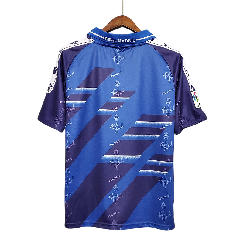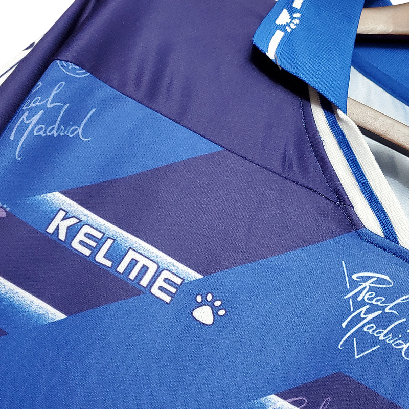 Mítica camiseta del Real Madrid de la temporada 1994-95, diseñada por Kelme y utilizada como segunda equipación en un año histórico donde el equipo, con figuras como Raúl, Zamorano y Laudrup, conquistó LaLiga y protagonizó el inolvidable 5-0 contra el Barcelona. Su diseño en tonos azulados con detalles geométricos y las firmas de los jugadores en el tejido la convierten en una de las camisetas más emblemáticas de la época.
