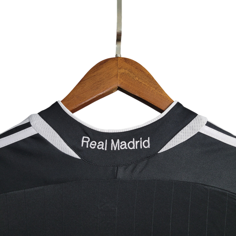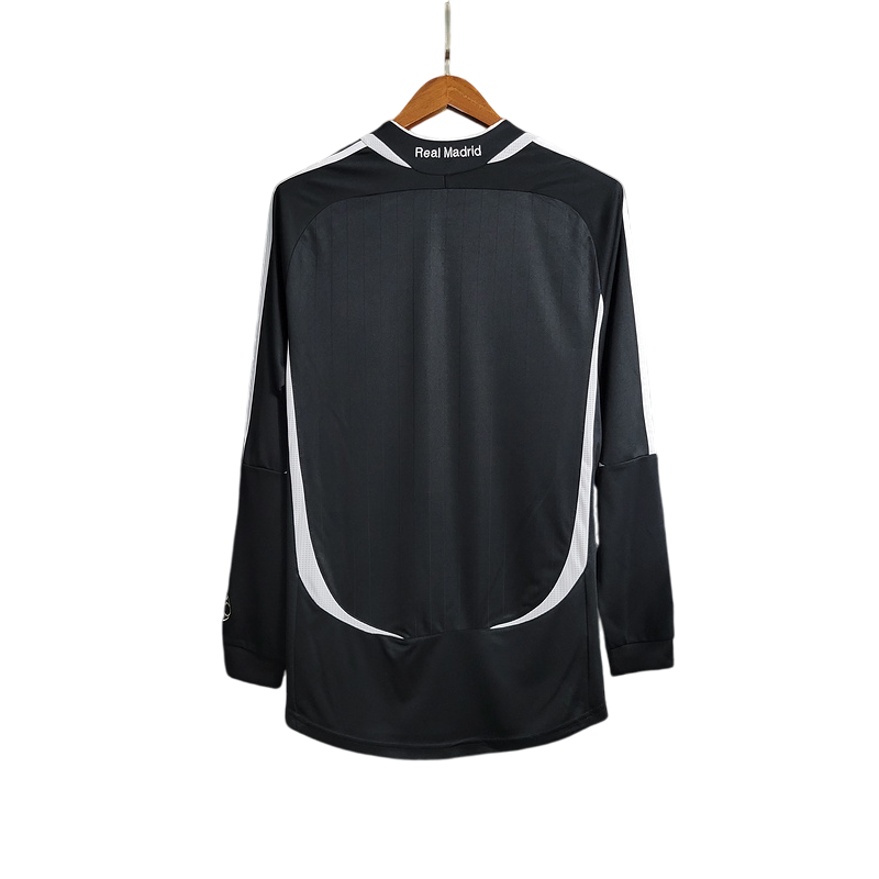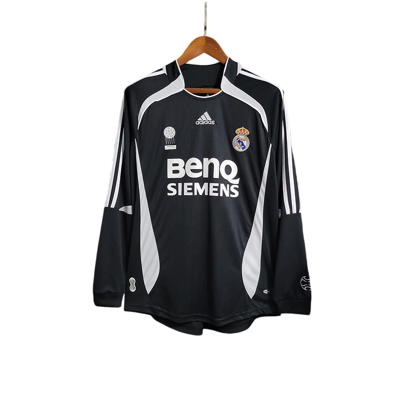 Imponente segunda equipación del Real Madrid de la temporada 2006/07 en su versión de manga larga, diseñada por Adidas y patrocinada por BenQ Siemens, con un elegante diseño en negro con detalles en blanco. Esta camiseta fue testigo de la histórica remontada en LaLiga, donde el equipo dirigido por Fabio Capello, con estrellas como Raúl, Van Nistelrooy y Beckham, logró el título en la última jornada tras una intensa lucha con el Barcelona. Un diseño icónico que representa la garra y la grandeza del Madrid.