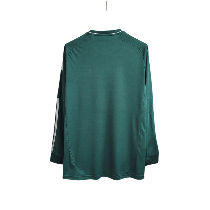 Elegante tercera equipación del Real Madrid de la temporada 2012/13 en su versión de manga larga, diseñada por Adidas y patrocinada por Bwin, con un inusual pero llamativo diseño en verde oscuro con detalles en blanco. Esta camiseta fue utilizada en partidos de la Champions League, torneo en el que el equipo de José Mourinho, con estrellas como Cristiano Ronaldo, Özil y Sergio Ramos, alcanzó las semifinales en una intensa eliminatoria contra el Borussia Dortmund. Un diseño único que quedó en la memoria de los aficionados.