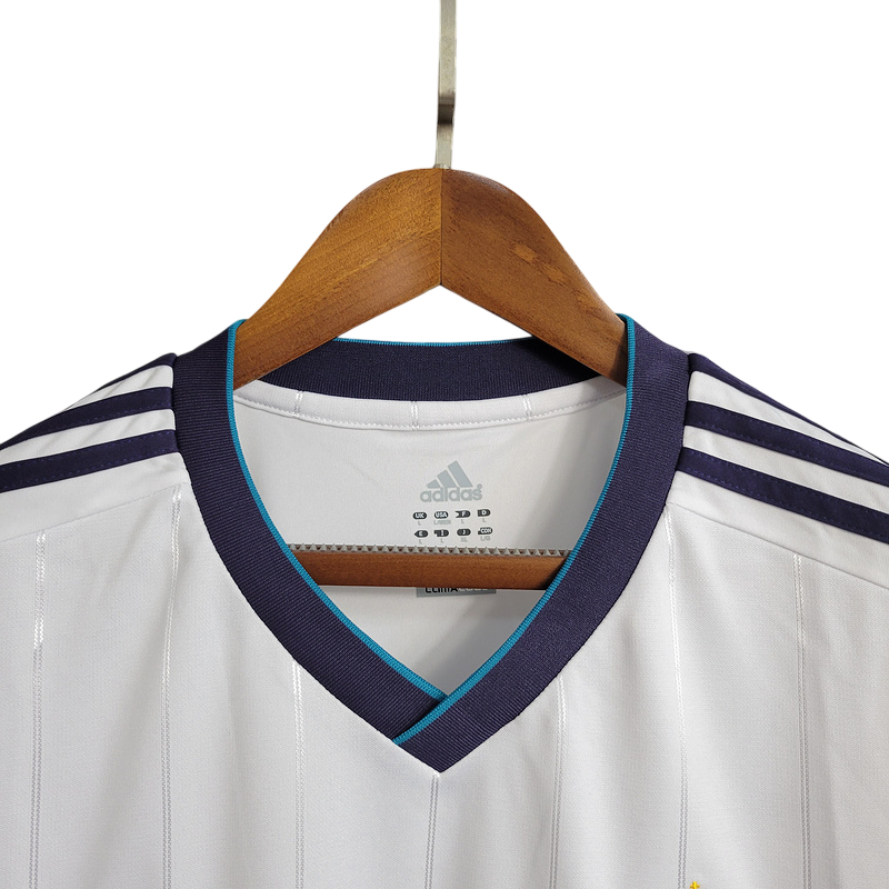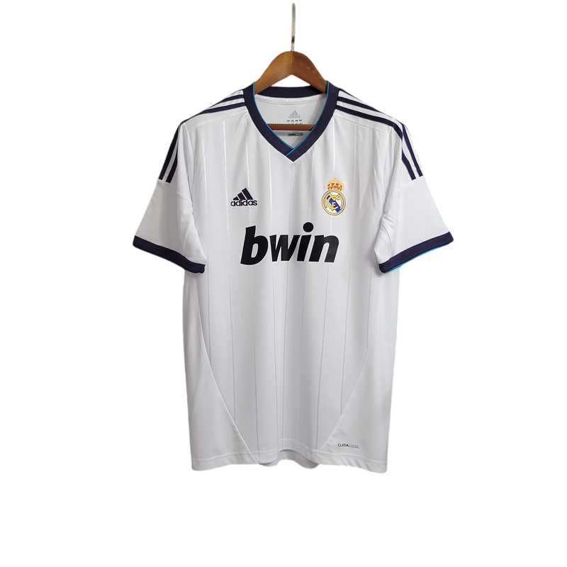 Elegante primera equipación del Real Madrid de la temporada 2012/13, diseñada por Adidas y patrocinada por Bwin, con un diseño clásico en blanco con detalles en azul marino y un sutil patrón de líneas verticales. En esta temporada, el equipo dirigido por José Mourinho y liderado por figuras como Cristiano Ronaldo, Özil y Sergio Ramos, conquistó la Supercopa de España, venciendo al Barcelona en una emocionante final. Una camiseta que representa la intensidad y el carácter competitivo de aquella era.