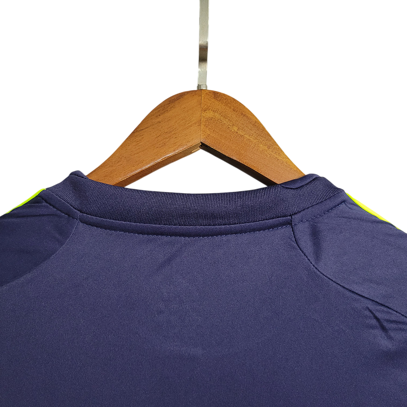 Imponente segunda equipación del Real Madrid de la temporada 2012/13, diseñada por Adidas y patrocinada por Bwin, con un diseño en azul marino con detalles en verde neón que le otorgan un estilo moderno y llamativo. Durante esta campaña, el equipo dirigido por José Mourinho, con figuras como Cristiano Ronaldo, Özil y Sergio Ramos, logró la Supercopa de España tras vencer al Barcelona en una final vibrante. Un diseño único que marcó el cierre de la era Mourinho en el club.