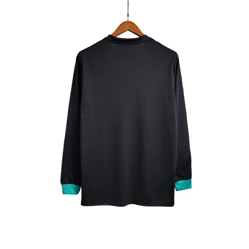 La versión de manga larga de la segunda equipación del Real Madrid 2017/18 presenta un elegante diseño negro con detalles en verde turquesa. Fabricada con tecnología Climacool, brinda comodidad y transpirabilidad. Esta camiseta acompañó al equipo en una de sus temporadas más exitosas, culminando con la conquista de la Champions League por tercera vez consecutiva.