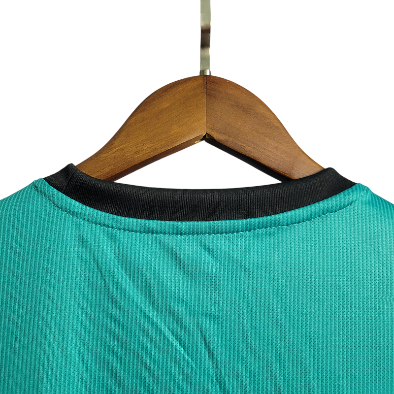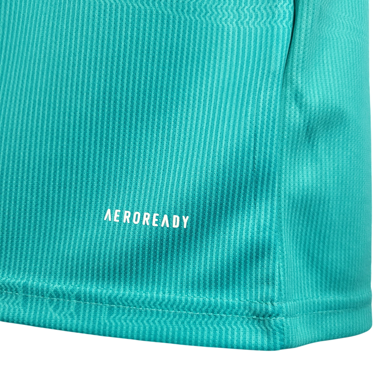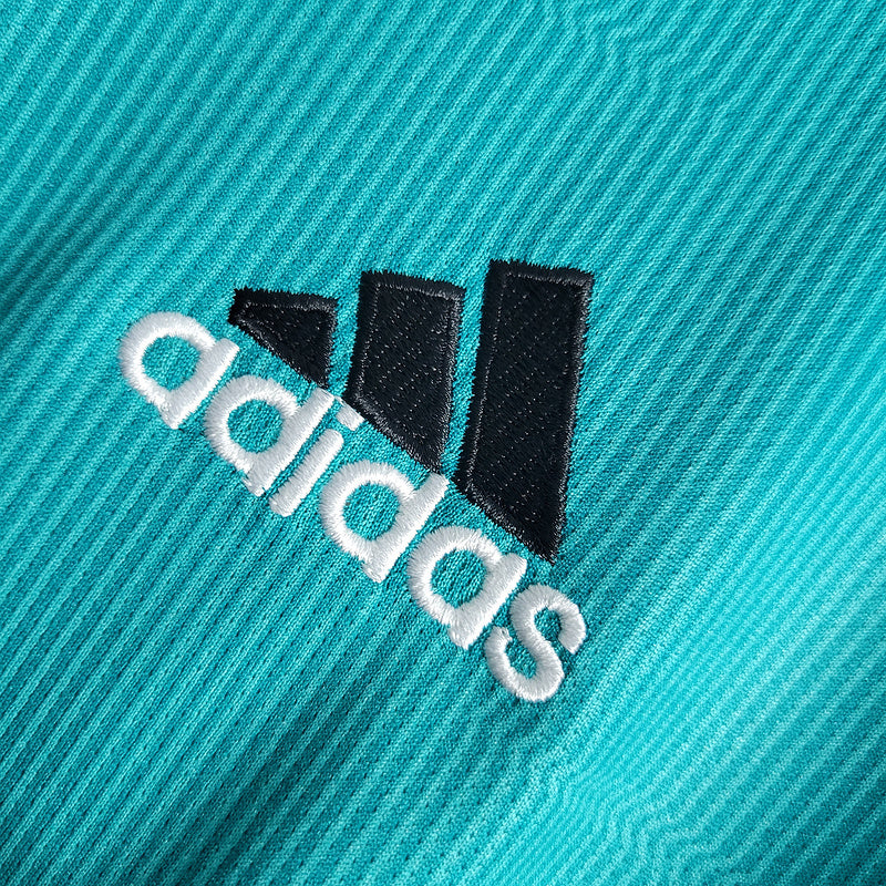 La tercera equipación del Real Madrid en la temporada 2021/22 destacó por su tono azul turquesa con detalles en blanco y negro, un diseño moderno y vibrante. Esta camiseta acompañó al equipo en un año histórico, en el que conquistaron LaLiga y la Champions League, con una remontada inolvidable contra el PSG, Chelsea y Manchester City. Karim Benzema se consolidó como el líder del equipo, firmando una temporada legendaria que le valió el Balón de Oro.