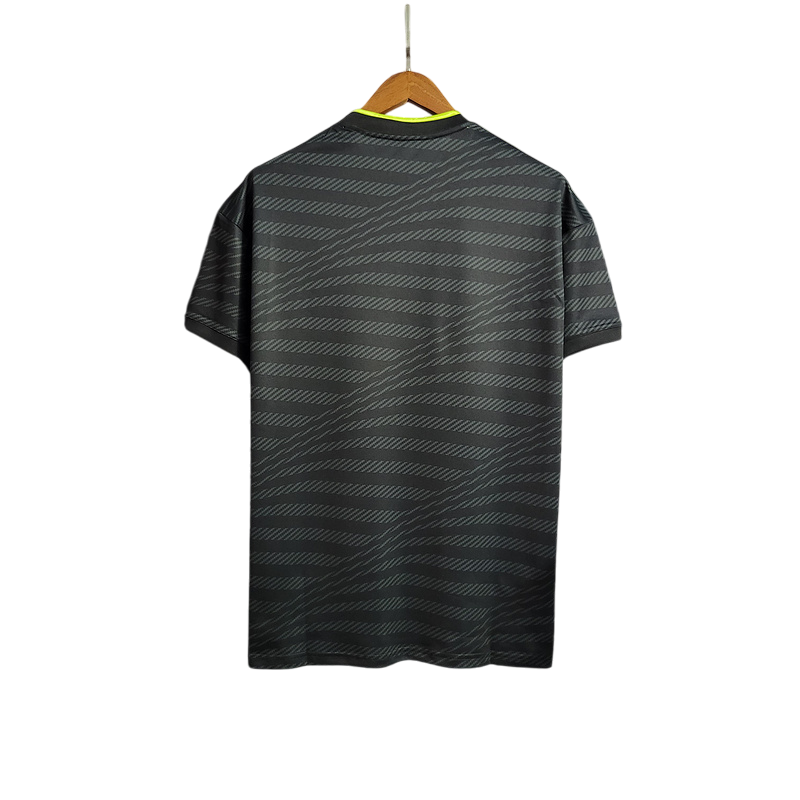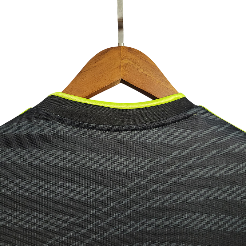El Real Madrid presentó en la temporada 2022/23 una camiseta de visitante en color negro con detalles en amarillo neón, una combinación moderna y vibrante. Esta equipación acompañó al equipo en competiciones como LaLiga, la Supercopa de Europa y la Champions League, con actuaciones destacadas de jugadores como Karim Benzema y Vinícius Jr. Además, esta temporada quedó marcada por la conquista de la Supercopa de Europa y la Copa del Rey, sumando más trofeos a la gloriosa historia del club.