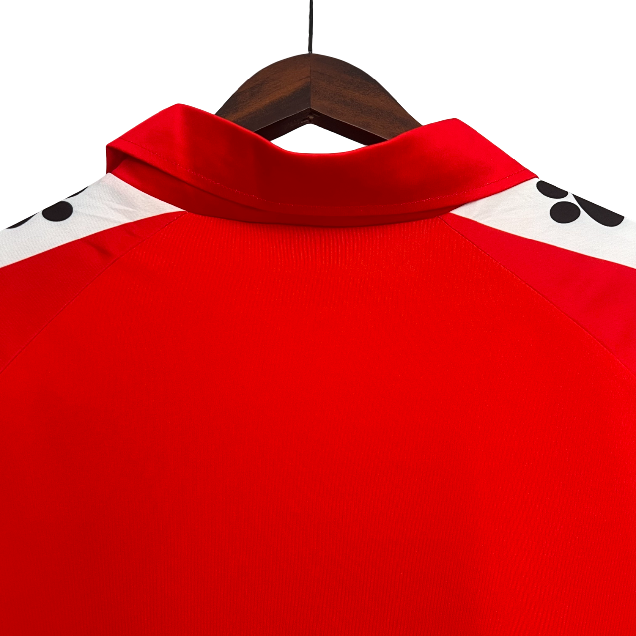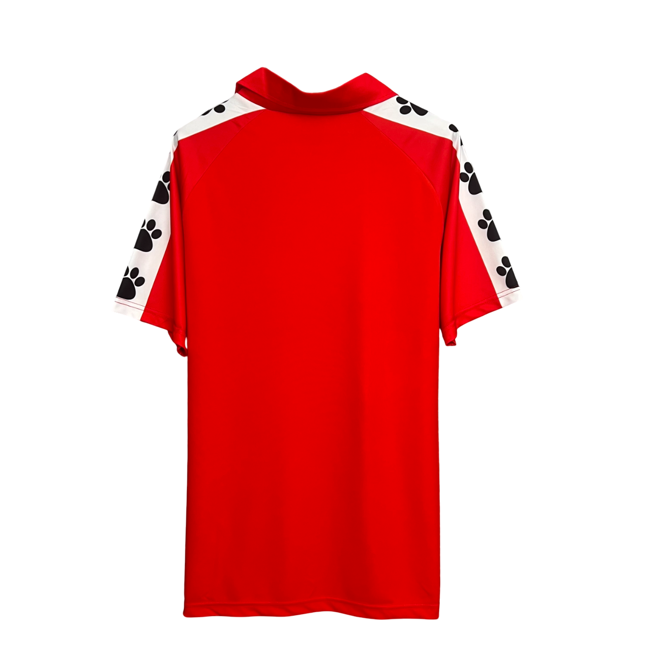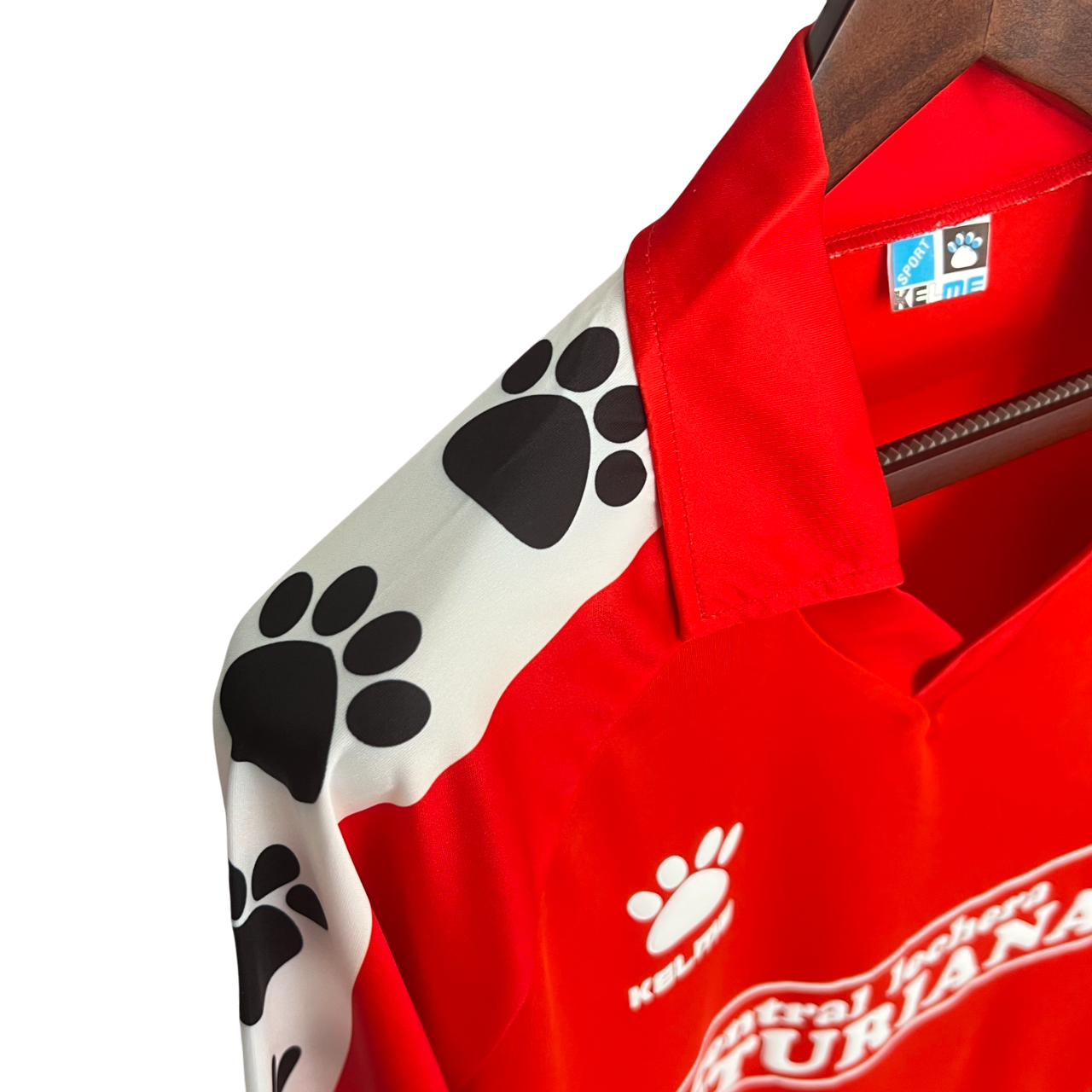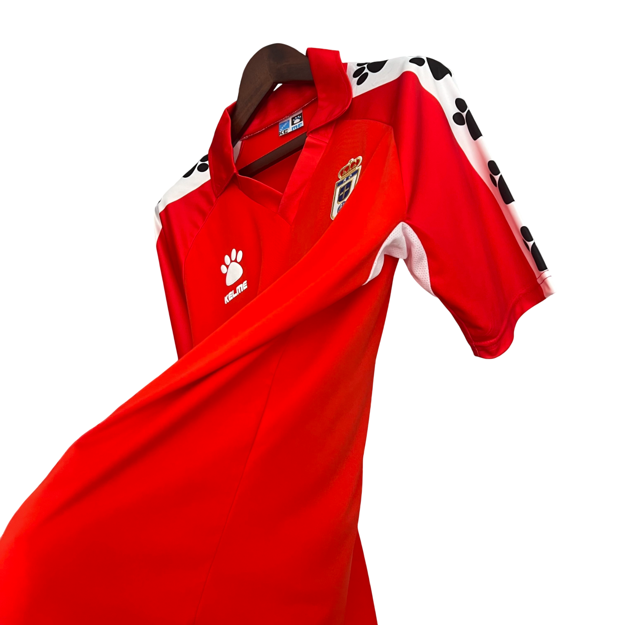Revive la magia de los años 90 con esta camiseta clásica del Real Oviedo. Con su característico color rojo intenso, el detalle inconfundible de las huellas negras en los hombros y el patrocinio histórico de Central Lechera Asturiana, esta prenda es un auténtico icono del fútbol español.