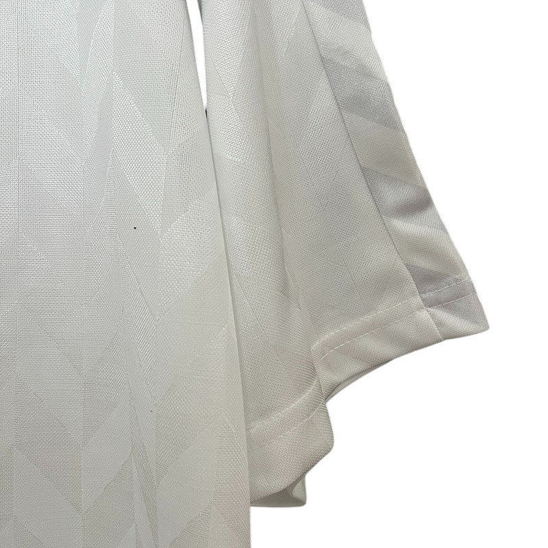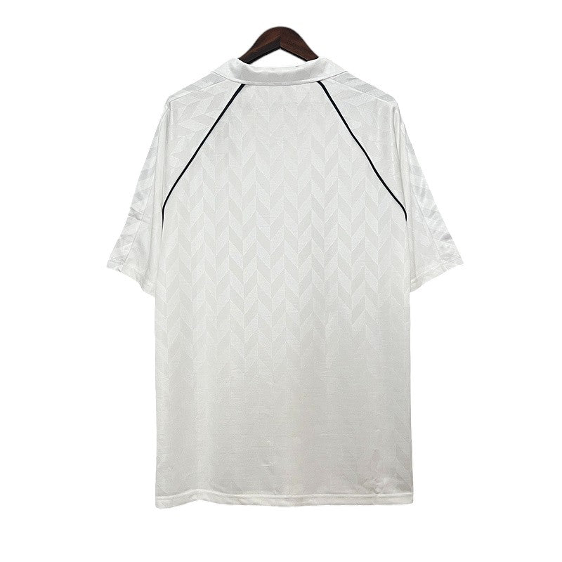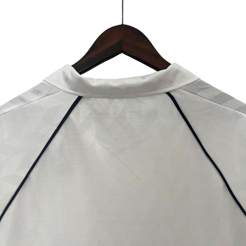 La primera equipación del Tottenham Hotspur 1988/89, diseñada por Hummel, es un clásico atemporal con su diseño en blanco puro, detalles en azul marino y el icónico patrocinador Holsten en el pecho. Esta camiseta destaca por su patrón en relieve en forma de chevron, característico de Hummel en los años 80. Durante esta temporada, los "Spurs" contaban con figuras como Paul Gascoigne, Chris Waddle y Gary Lineker, jugadores que dejaron una huella imborrable en la historia del club.