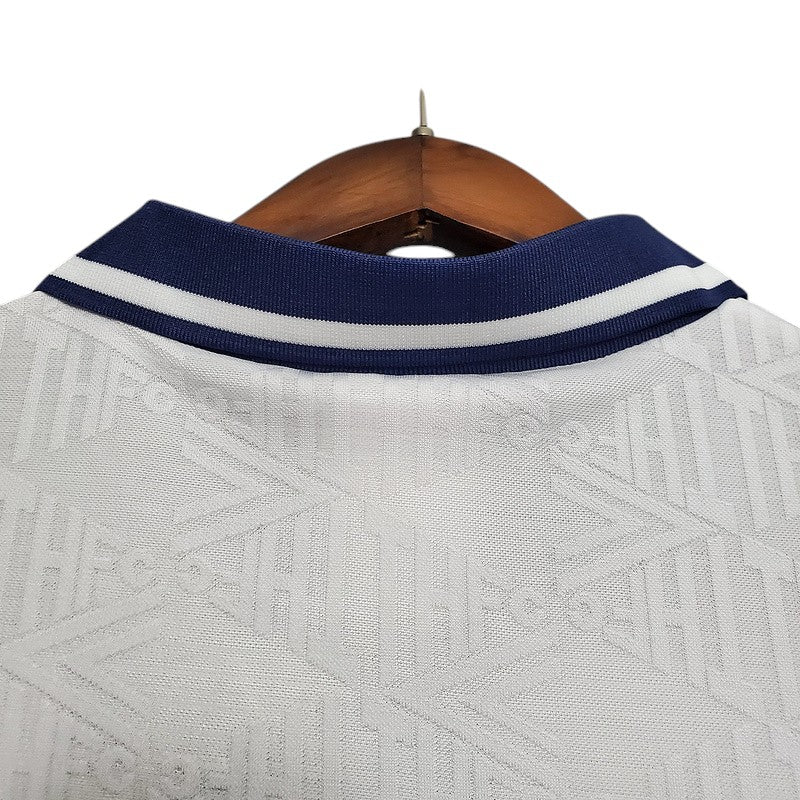 La primera equipación del Tottenham Hotspur 1994/95, diseñada por Umbro, presenta un diseño clásico en blanco con detalles en azul marino, incluyendo un elegante cuello con botones y el icónico patrocinador Holsten en el pecho. Esta camiseta fue utilizada en una de las temporadas más recordadas de los "Spurs", con la llegada del delantero alemán Jürgen Klinsmann, quien dejó una marca imborrable con su talento y celebraciones icónicas. Junto a figuras como Teddy Sheringham y Darren Anderton, el Tottenham mostró un fútbol atractivo en la Premier League.