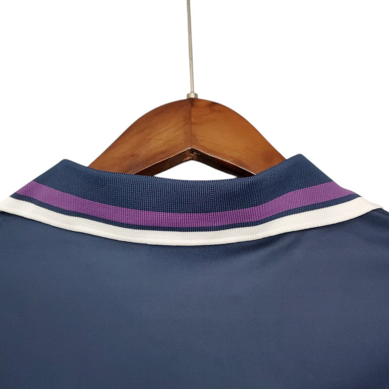 La segunda equipación del Tottenham Hotspur 1994/95, diseñada por Umbro, es una de las más recordadas de la década de los 90. Con un diseño en azul marino y detalles gráficos en morado, acompañado del icónico patrocinador Holsten, esta camiseta representó una era de gran talento en los "Spurs". Durante esta temporada, el equipo contó con figuras como Jürgen Klinsmann, Teddy Sheringham y Darren Anderton, logrando destacadas actuaciones en la Premier League y la FA Cup.